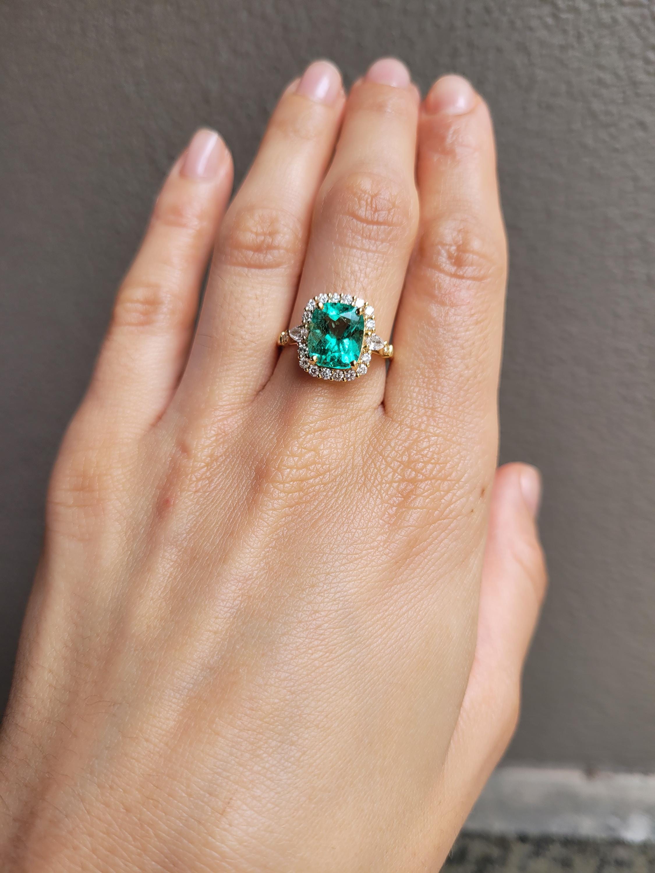 A magnificent Natural Colombian Emerald Statement Ring designed in 18 carats yellow gold presents a breathtaking 2.99 carats Colombian emerald with an enchanting vivid green colour. The emerald, featuring cushion cut, is surrounded by a gorgeous diamond halo. A pear cut diamond is delicately place at the start of the shank on each side and is followed by some more brilliant cut diamonds to elevate the design.
