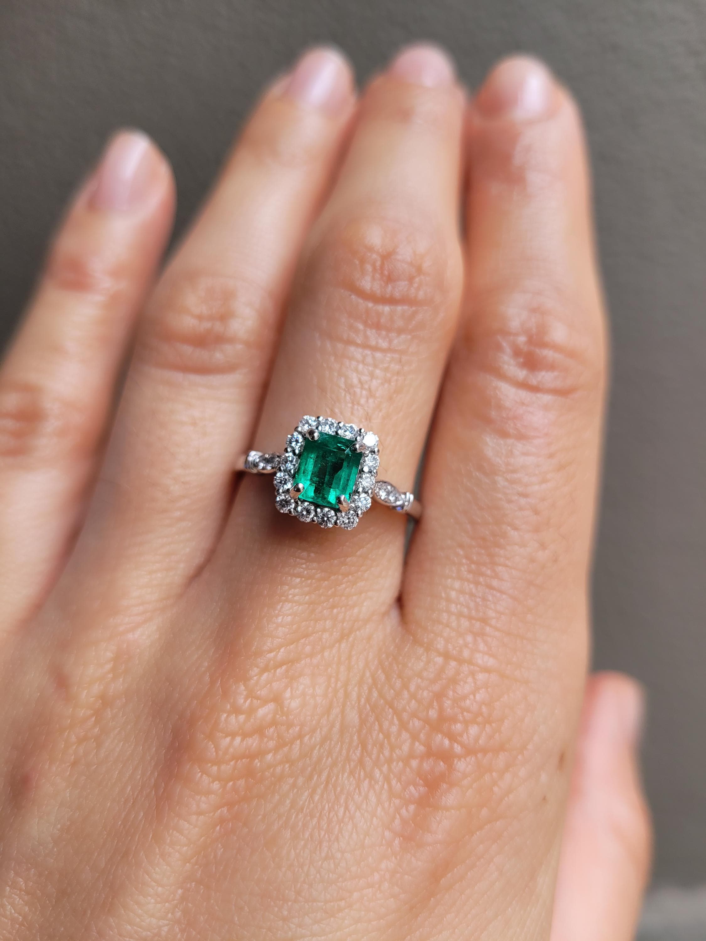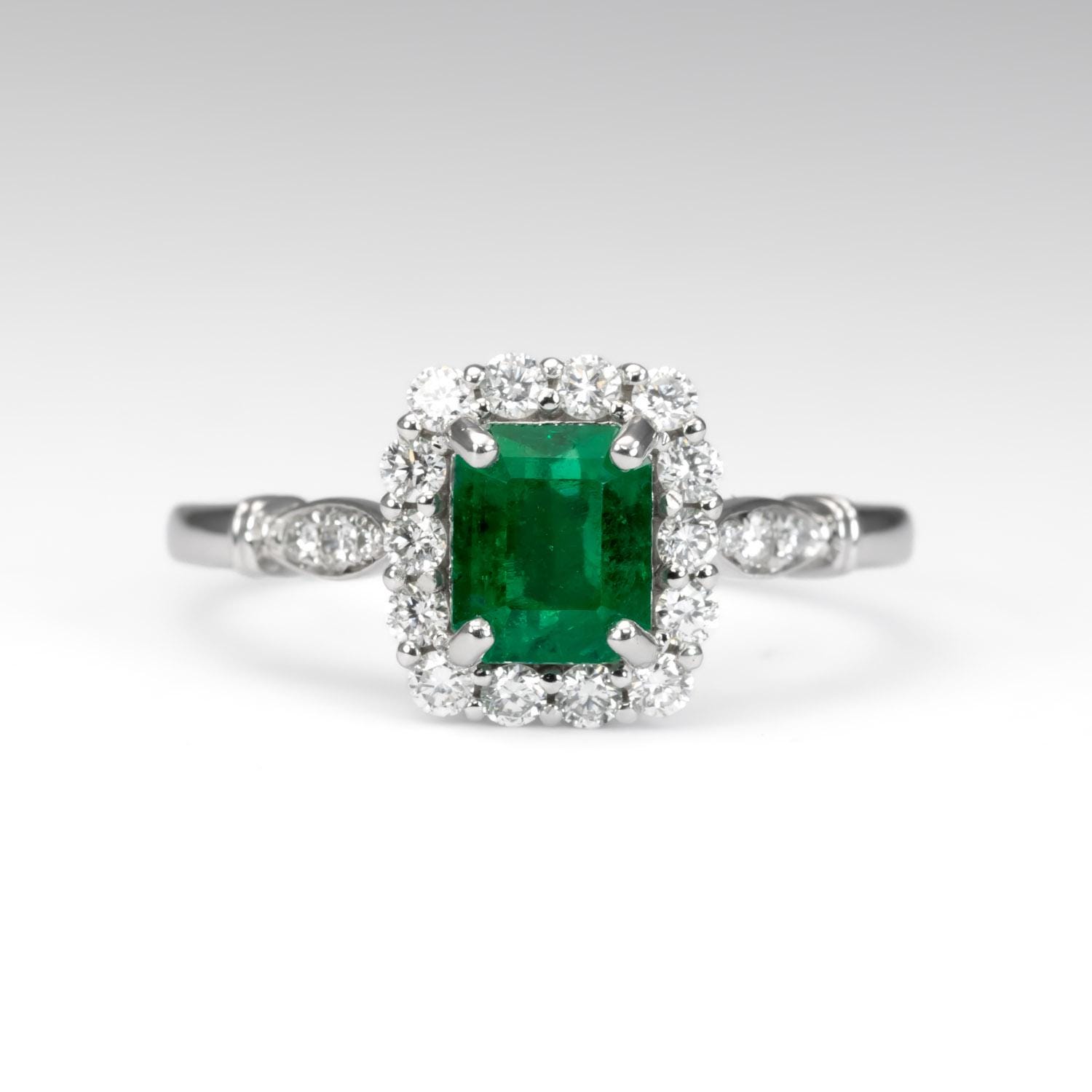 A timeless emerald cut Colombian emerald takes centre stage in this elegant halo ring. The natural emerald shines with intense vivid green colour, surrounded by sparkling round brilliant cut diamonds in E–F colour. Crafted in platinum, this ring combines classic style with lasting beauty—a piece made to be treasured for generations.