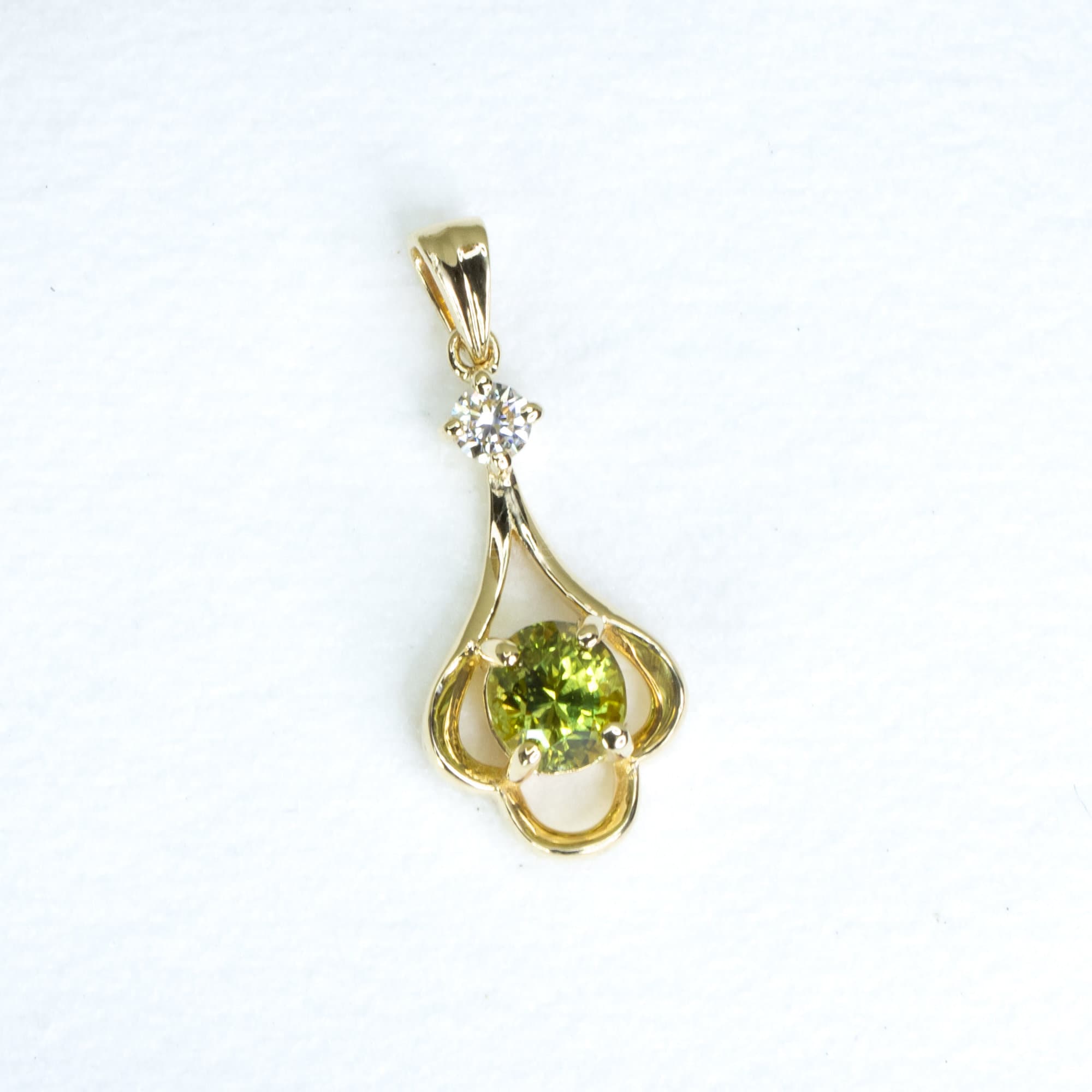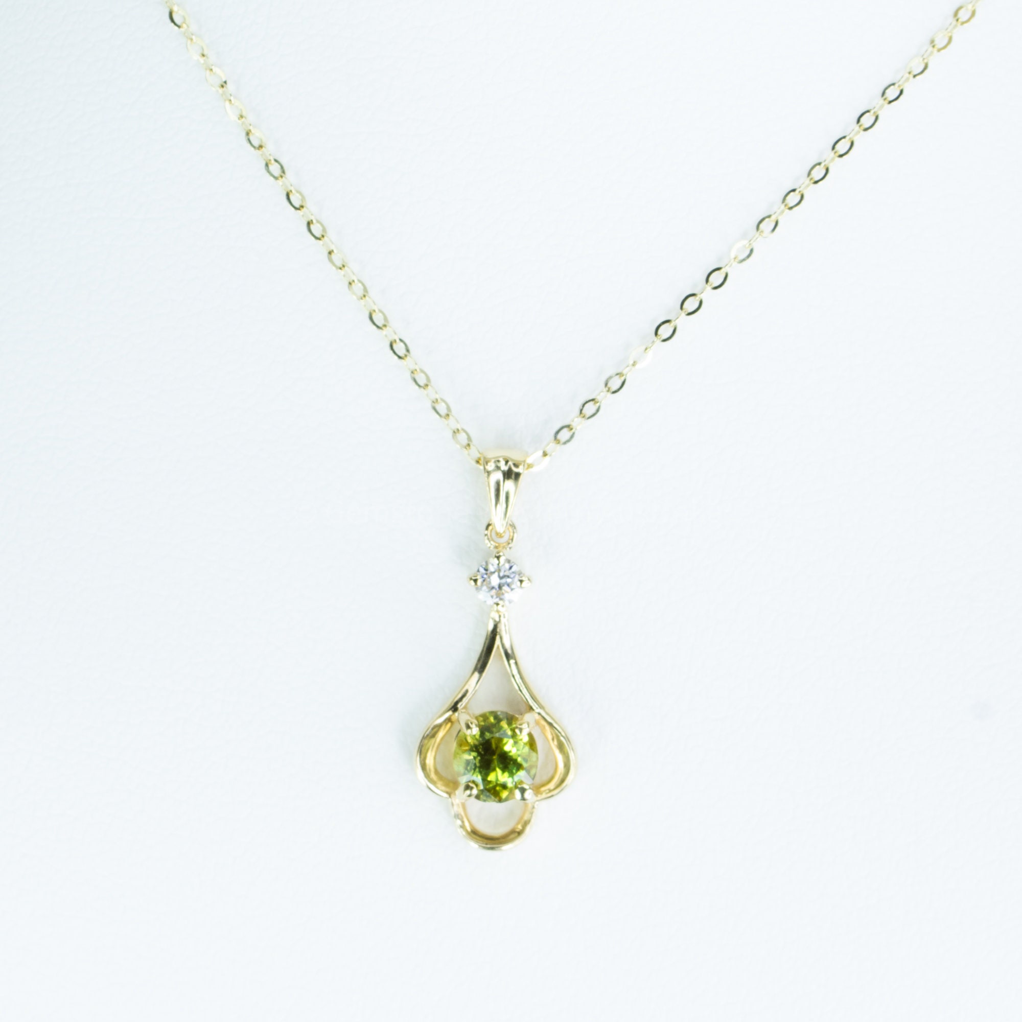A gorgeous Oval Cut Alexandrite Pendant Necklace features a natural alexandrite that features a captivating light green colour with stunning colour change when exposed to incandescent light. The Oval Cut Alexandrite sits at the bottom of a delicate gold drop design forming a beautiful pendant. The pendant is adorned with a round brilliant cut diamond set at the top of the gold drop design.