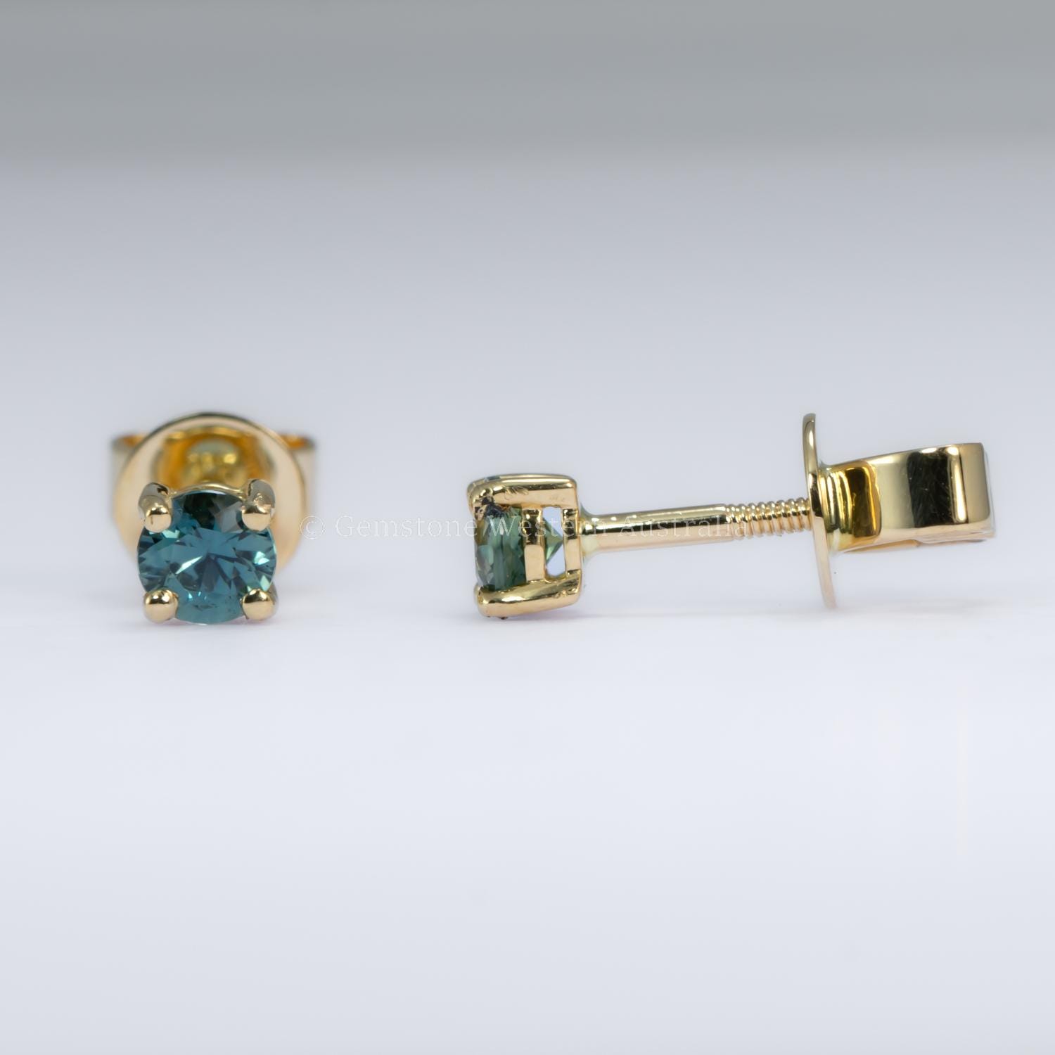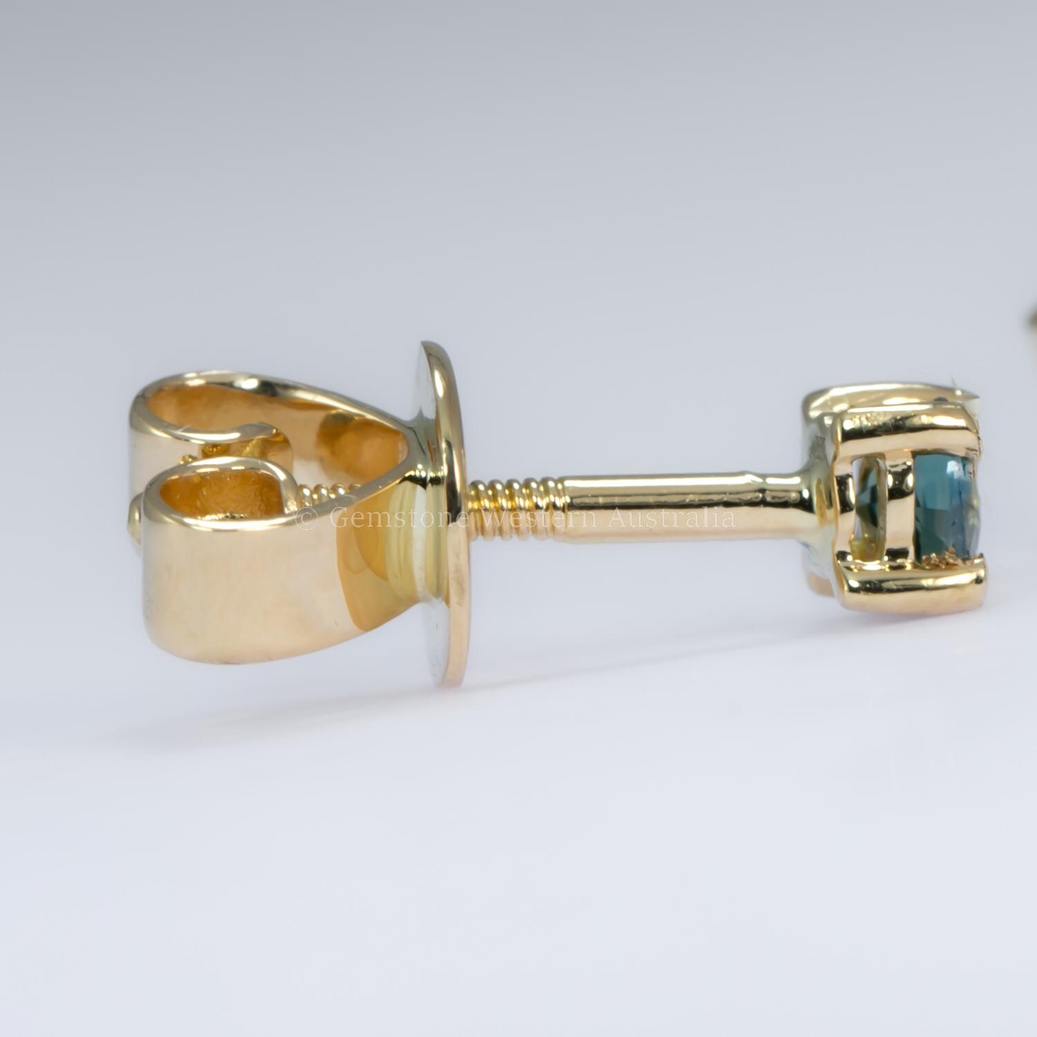 These classic stud earrings showcase 3.5mm round Australian teal sapphires, weighing 0.42ct, set in four-prong 18K yellow gold settings. The deep, vibrant teal hues of the natural sapphires add a sophisticated touch to any outfit, making these earrings a timeless addition to your jewellery collection.