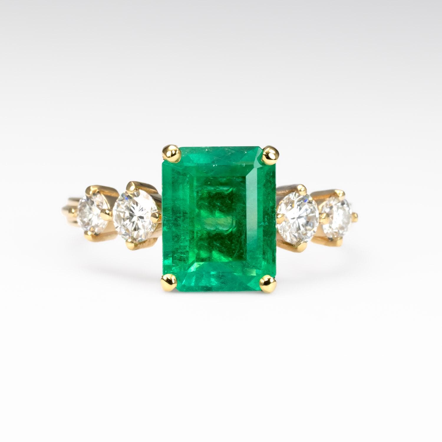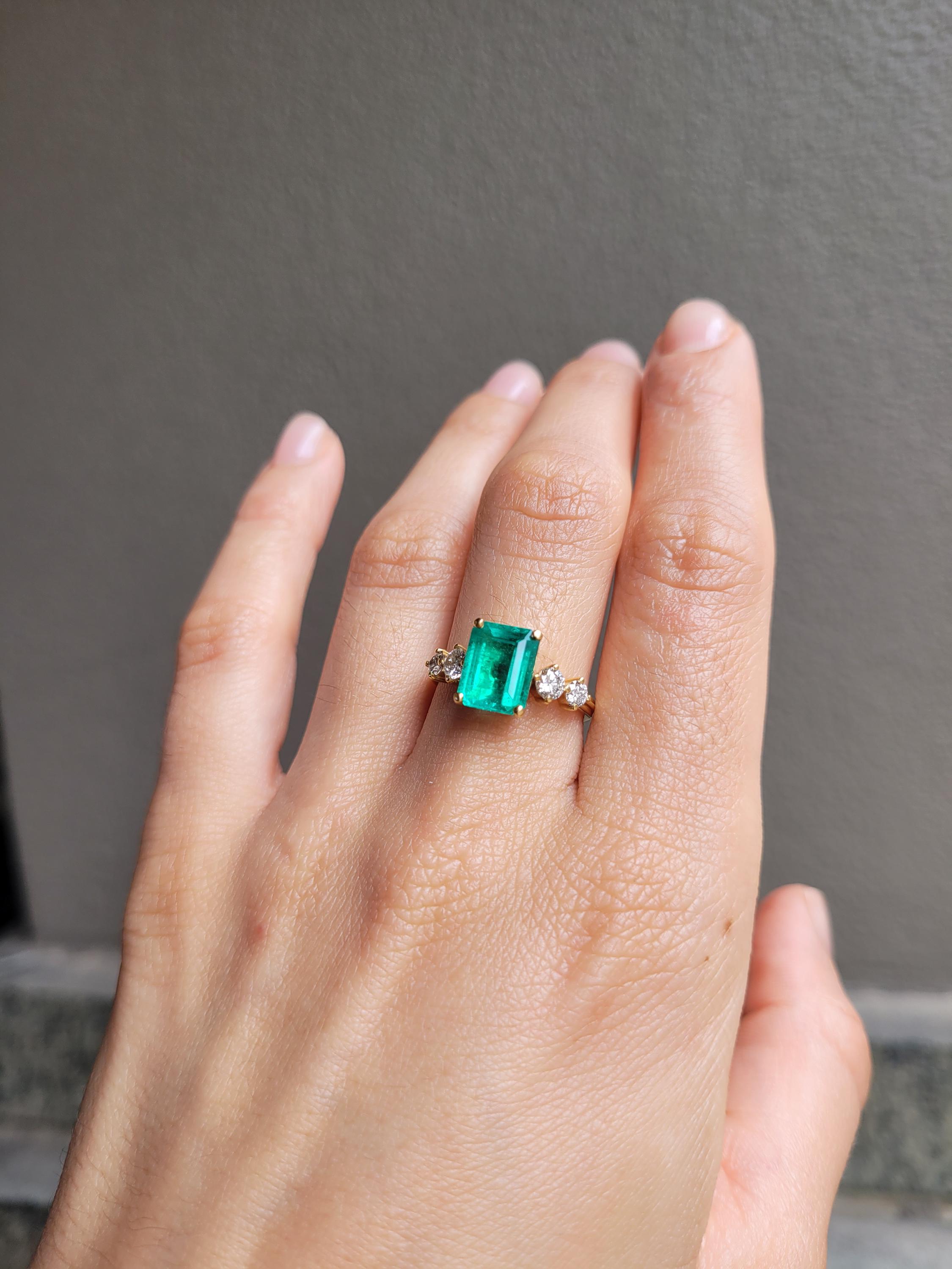 This 2.29ct natural Colombian emerald ring is a true showstopper, featuring a stunning emerald-cut Colombian emerald that radiates an intense, vibrant green hue. Known for their rarity and exceptional clarity, Colombian emeralds are some of the most sought-after gemstones in the world, and this piece is no exception. The emerald is beautifully flanked by two larger GIA-certified diamonds (3.5mm) and two smaller round brilliant-cut diamonds (2.9mm), each diamond carefully chosen for its sparkle and set in perfect harmony with the centre gem.