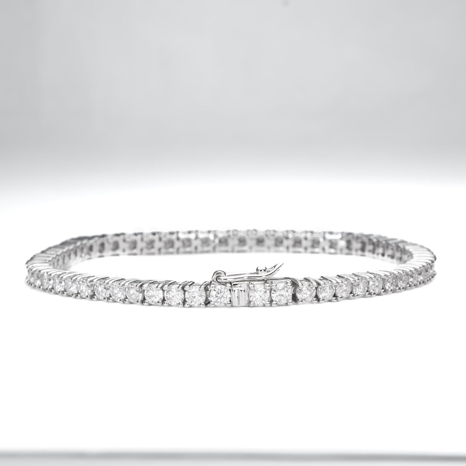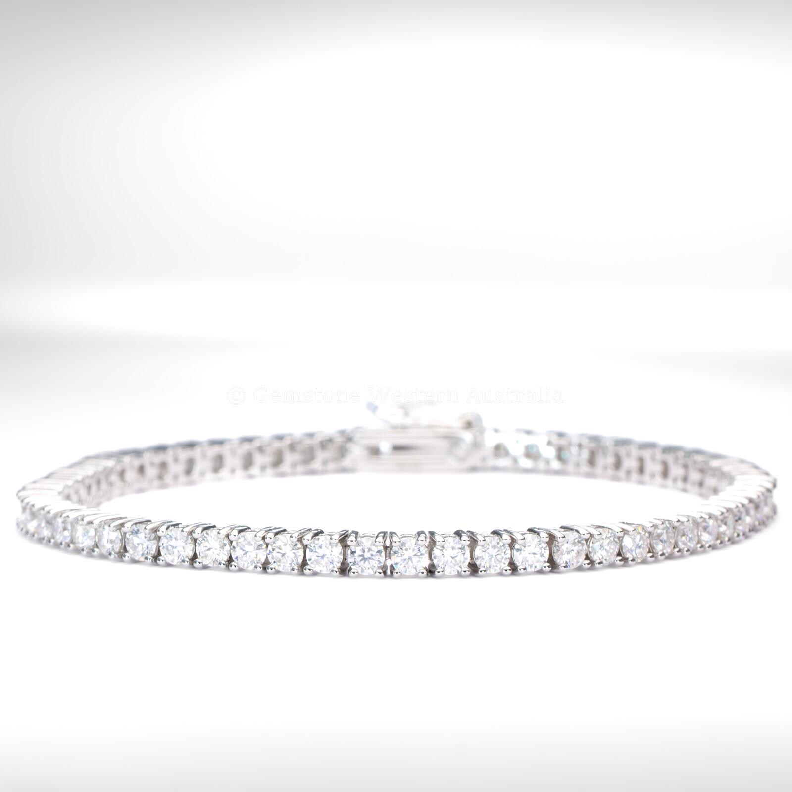 Silver moissanite tennis bracelet crafted in 925 sterling silver and set with 59 round brilliant moissanites, each measuring 2.9mm in diameter. Designed for elegance and comfort, this piece offers a refined, modern alternative to traditional diamond tennis bracelets. The moissanites deliver outstanding brilliance and fire, while the silver setting ensures lasting quality and shine.