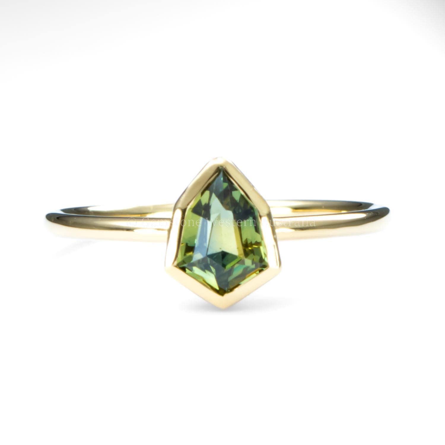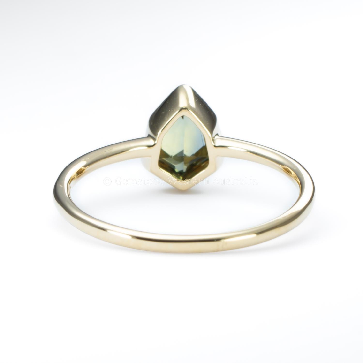 This elegant ring features a 0.71ct natural teal sapphire in a distinctive shield cut, bezel-set in 18K yellow gold. The unique geometry of the gemstone enhances its vivid blend of blue and green tones, creating a refined contrast against the warm gold setting.