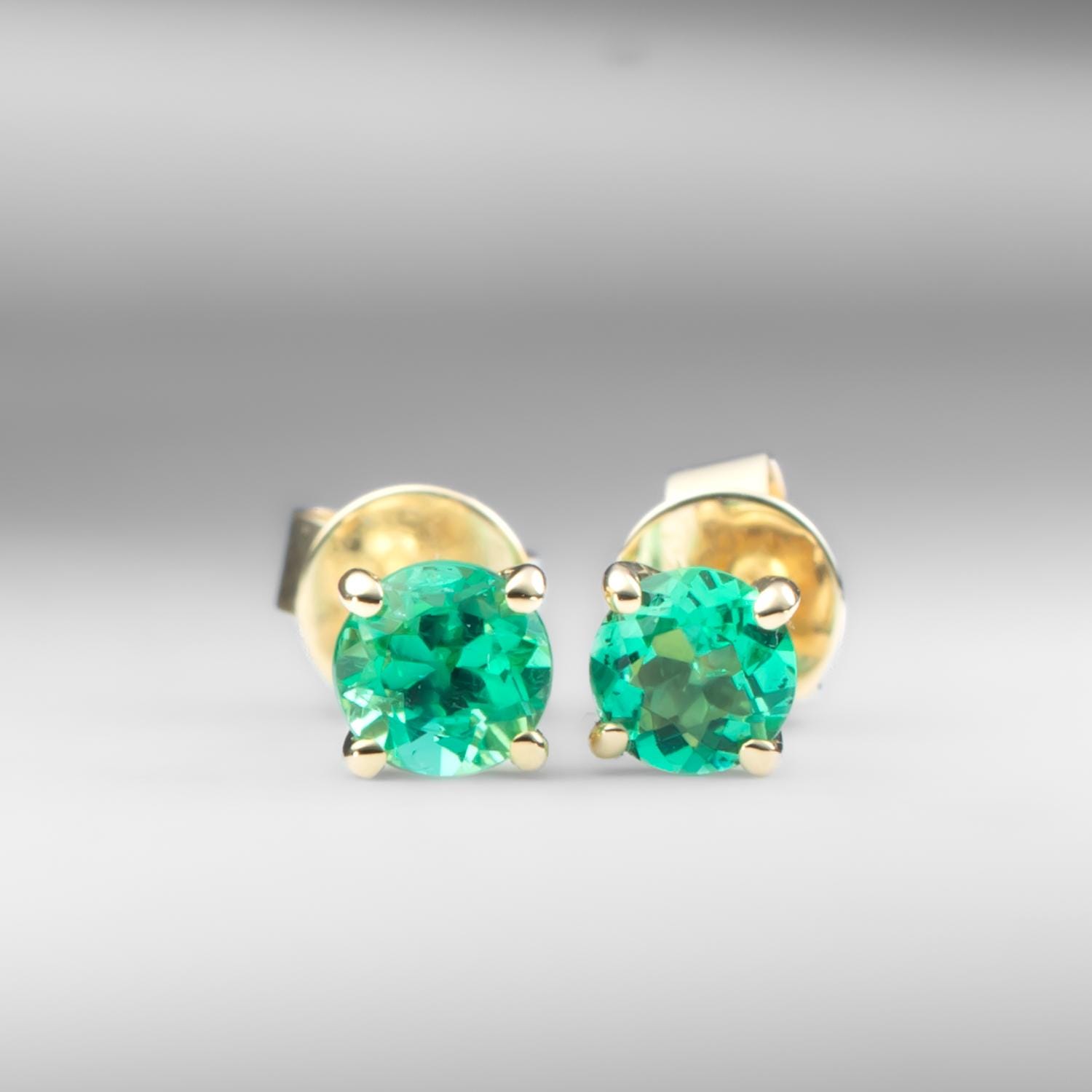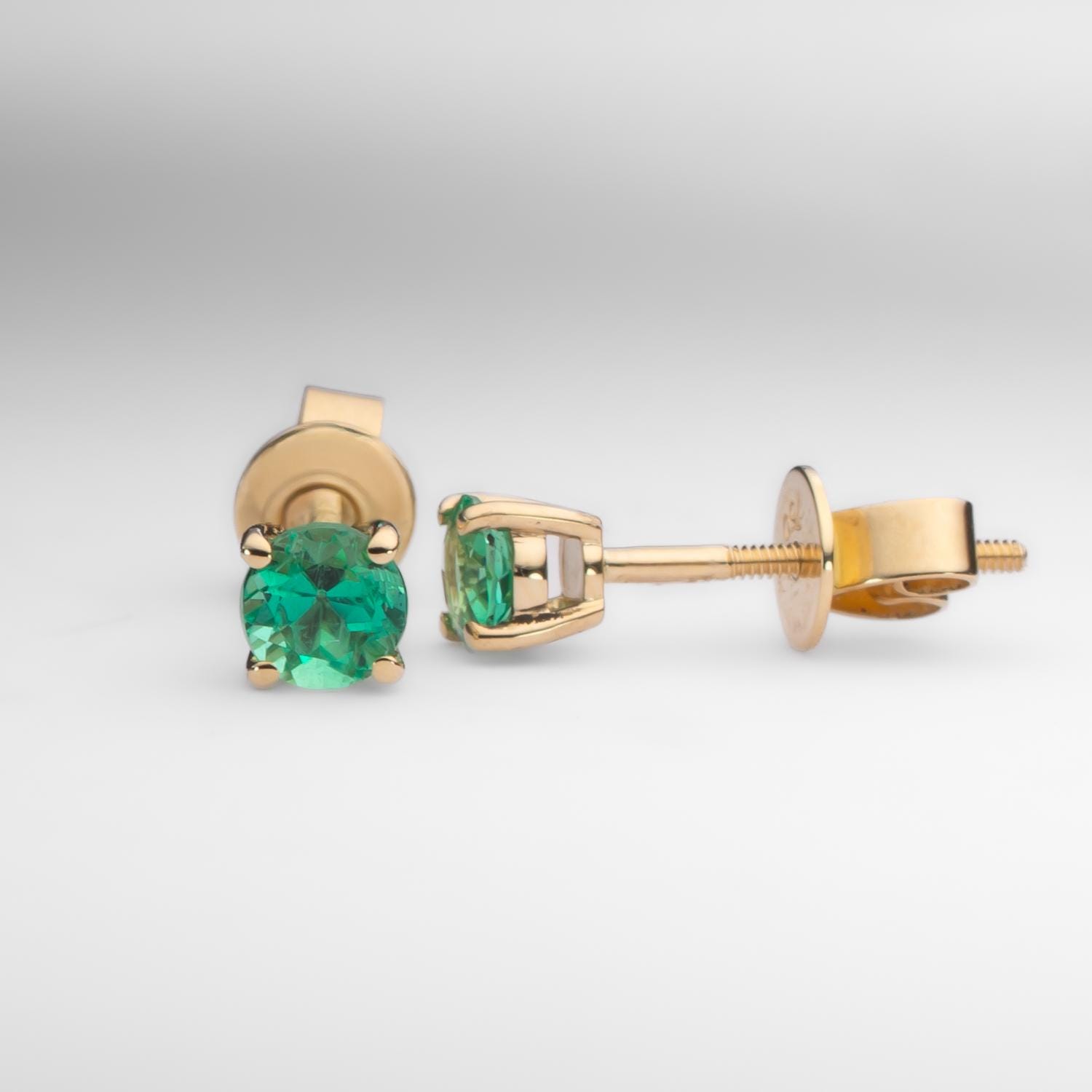 These elegant stud earrings feature two natural Colombian emeralds with a combined weight of 0.56 carat. Each round emerald is securely set in 18K yellow gold with a classic four-claw design that enhances the gemstone’s vivid green hue.