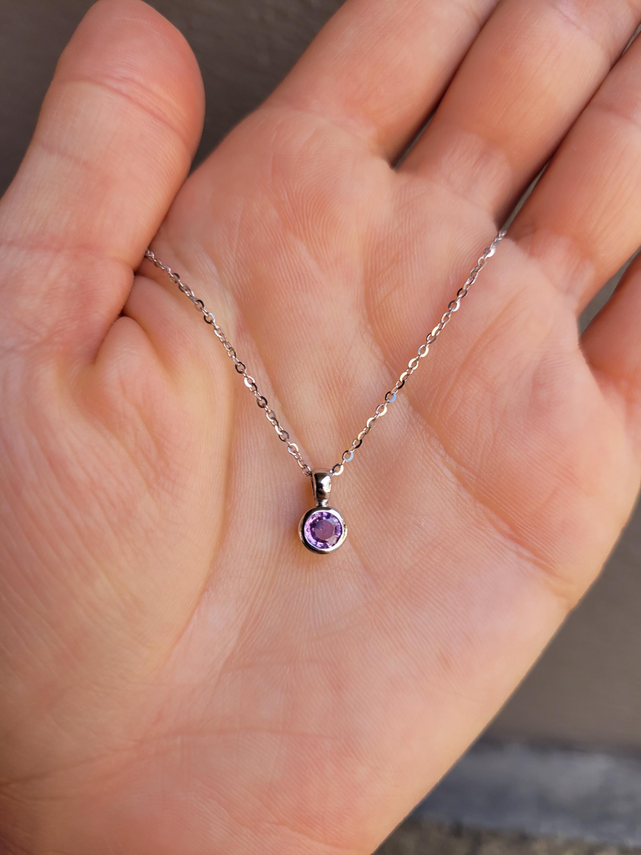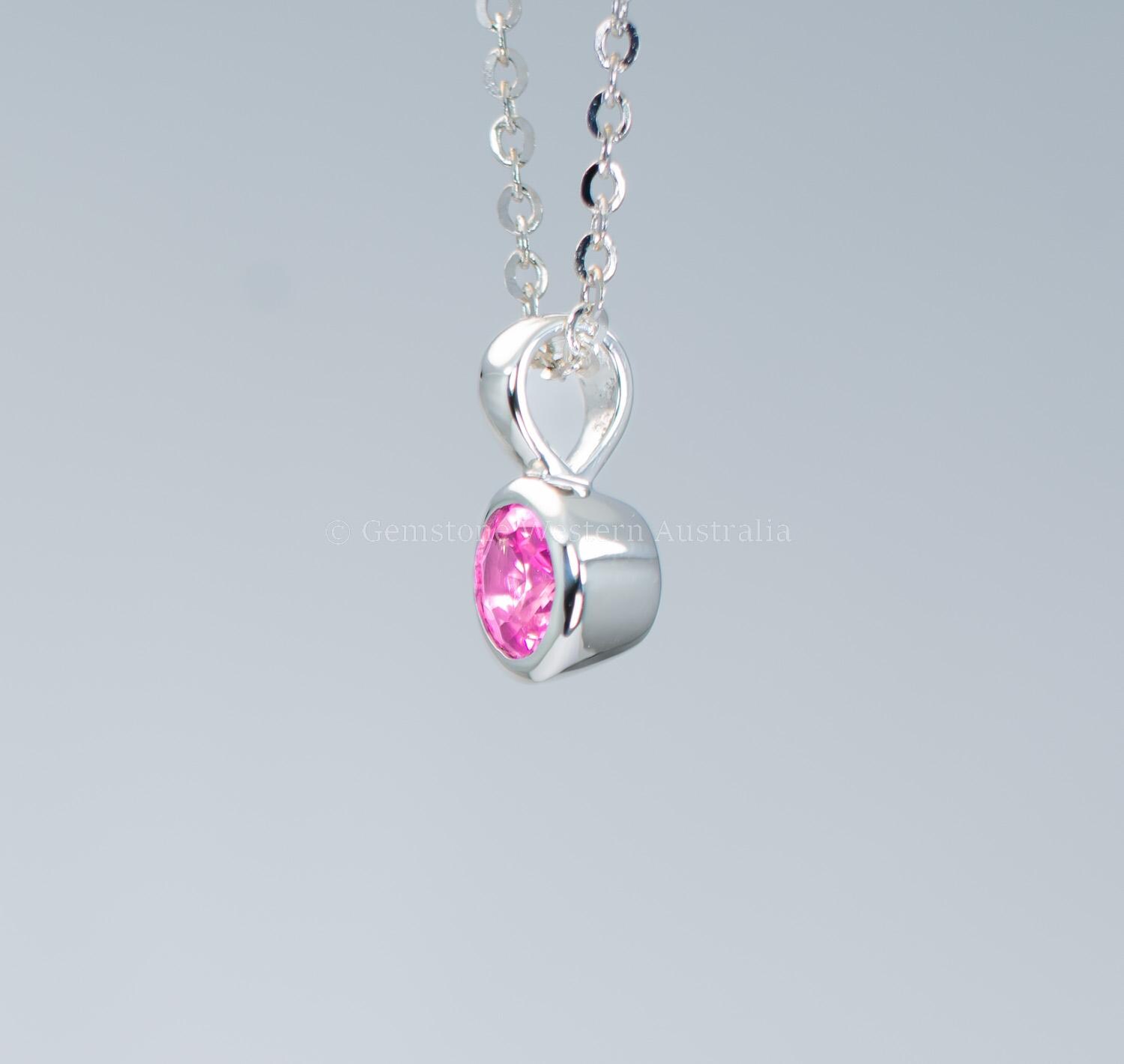 Natural unheated pink sapphire platinum pendant featuring a round 0.42 carat sapphire with a lively response to light. In bright white or outdoor light, the sapphire shows a vivid hot pink. Indoors, it softens into a gentle, elegant blush.