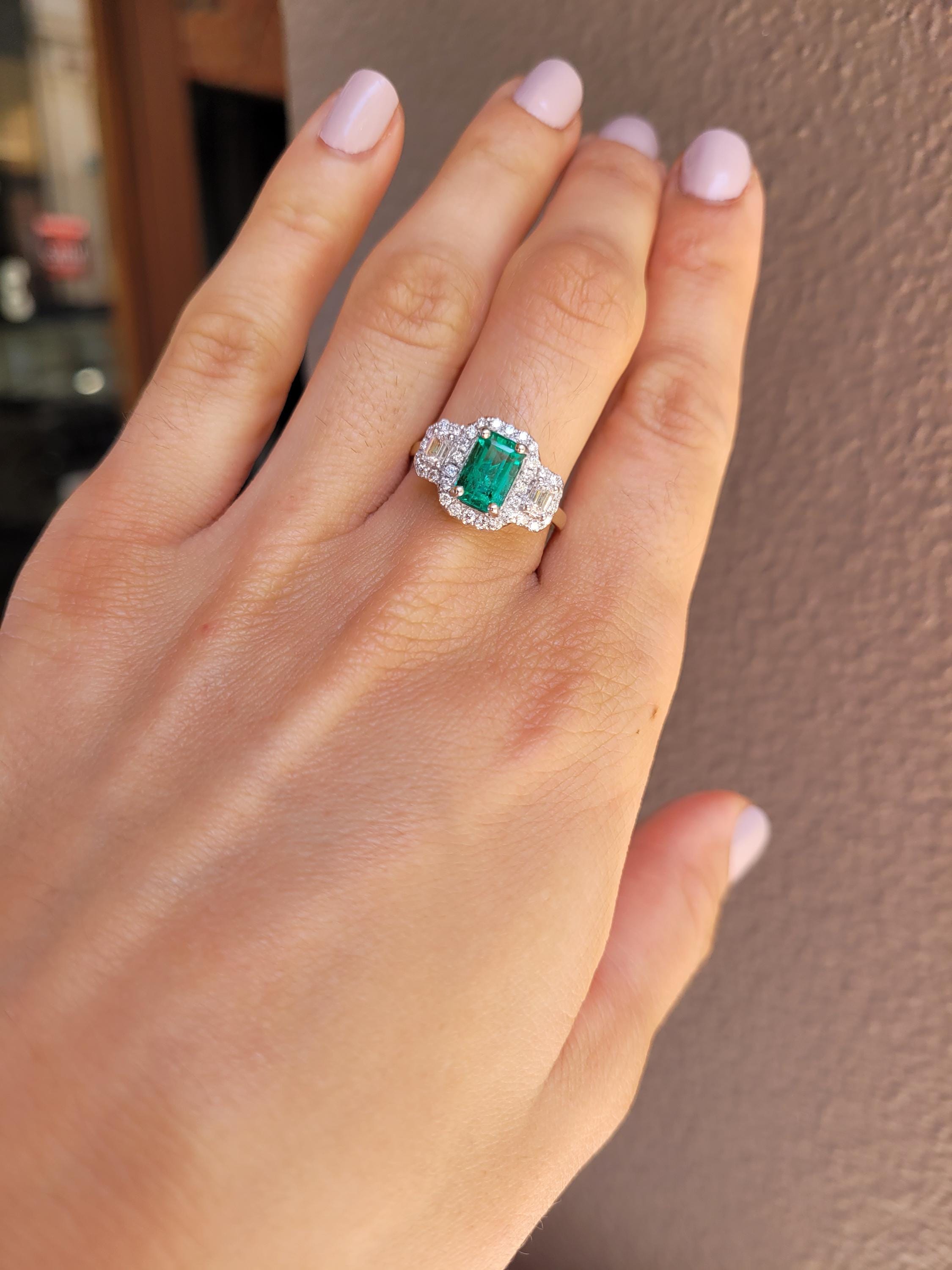 • Central stone: One elongated, emerald cut natural Colombian emerald. 8.0 x 5.8mm. Weight: 1.32ct.