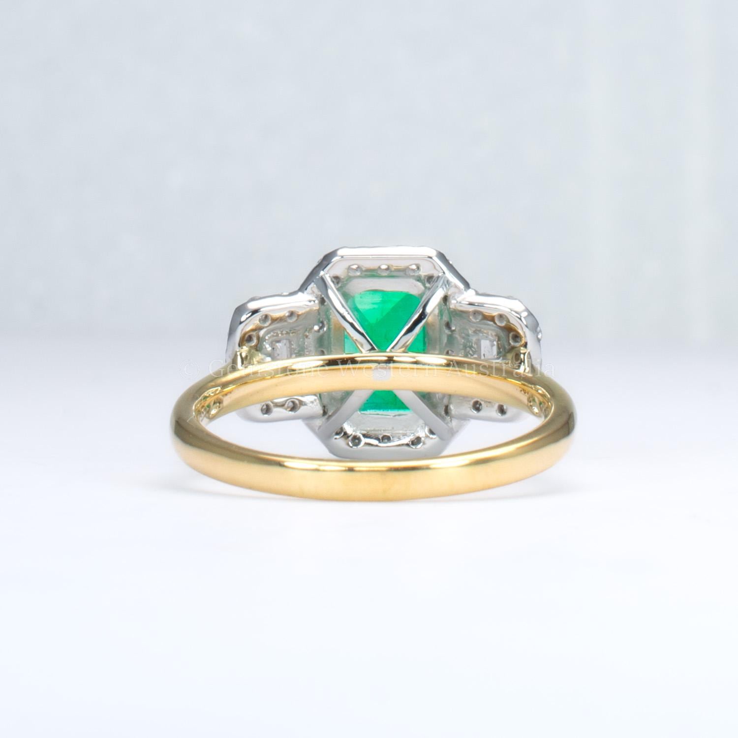 Elongated Colombian emerald three-stone halo ring crafted in Platinum 950 and 18K yellow gold. At the centre sits a natural Colombian emerald weighing 1.32 carats, displaying a vivid, luminous green with graceful transparency and refined presence.