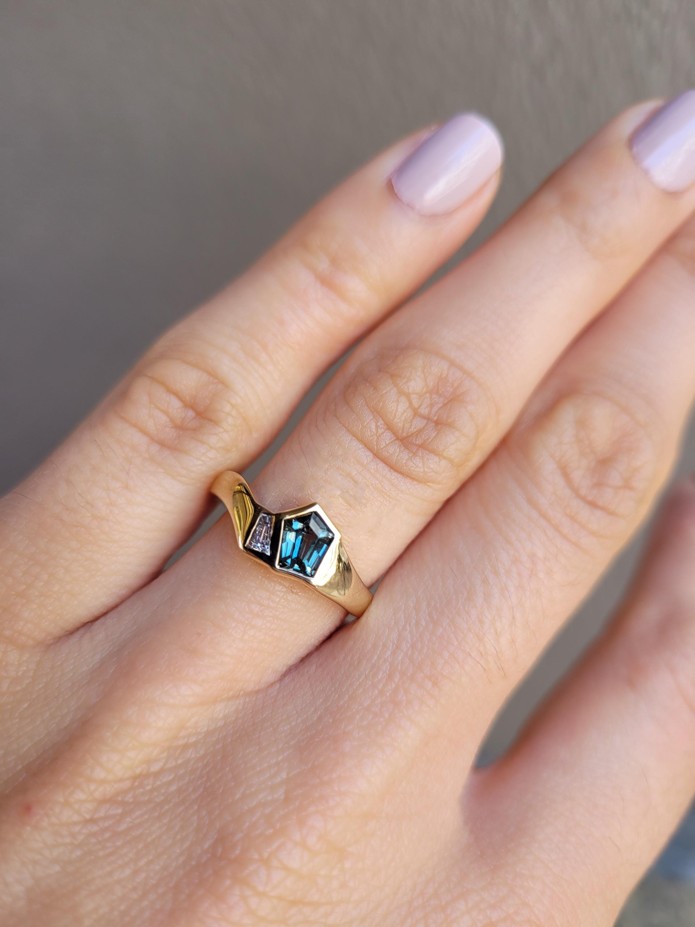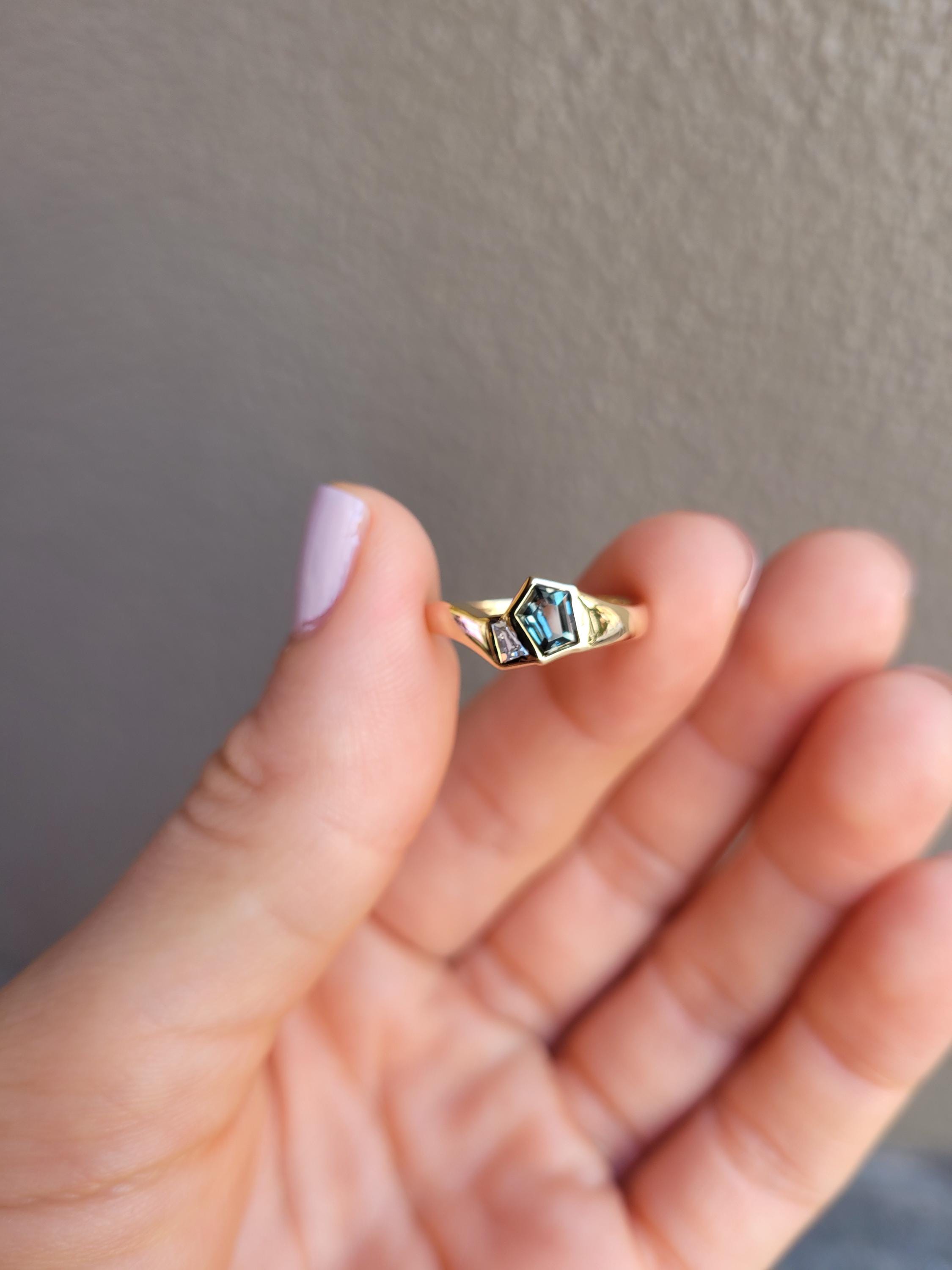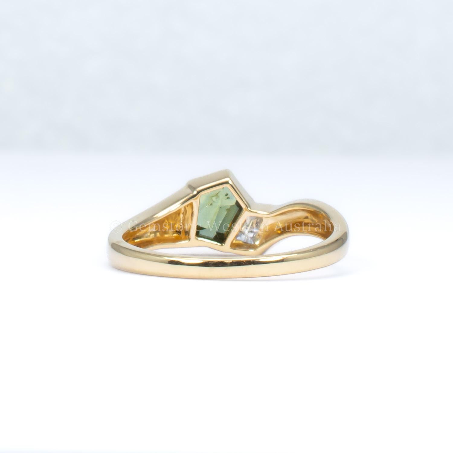 Unique pentagonal teal sapphire and diamond gold ring featuring a rare shield-cut natural teal sapphire set within a flowing 18K yellow gold wave band. The pentagonal form gives the gemstone a bold yet balanced character, while its green-blue tones shift softly with the light.