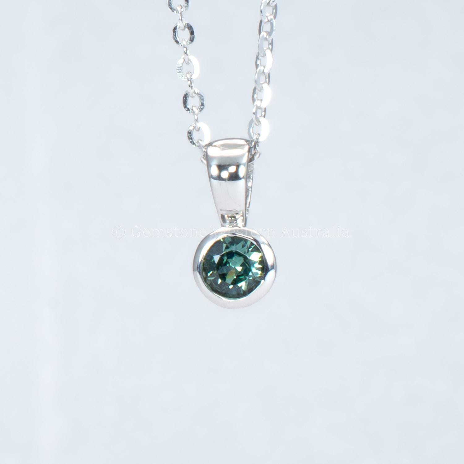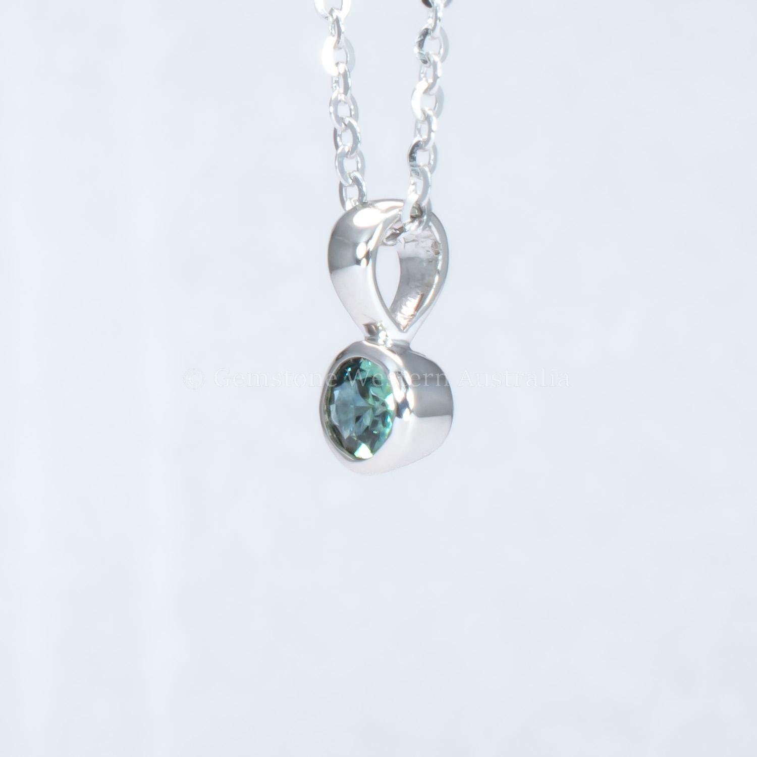 Natural Australian teal sapphire pendant featuring a 0.15 ct sapphire set in a smooth platinum 950 bezel. The gemstone reveals blue-green tones that shift gently with the light, offering a calm and elegant presence.