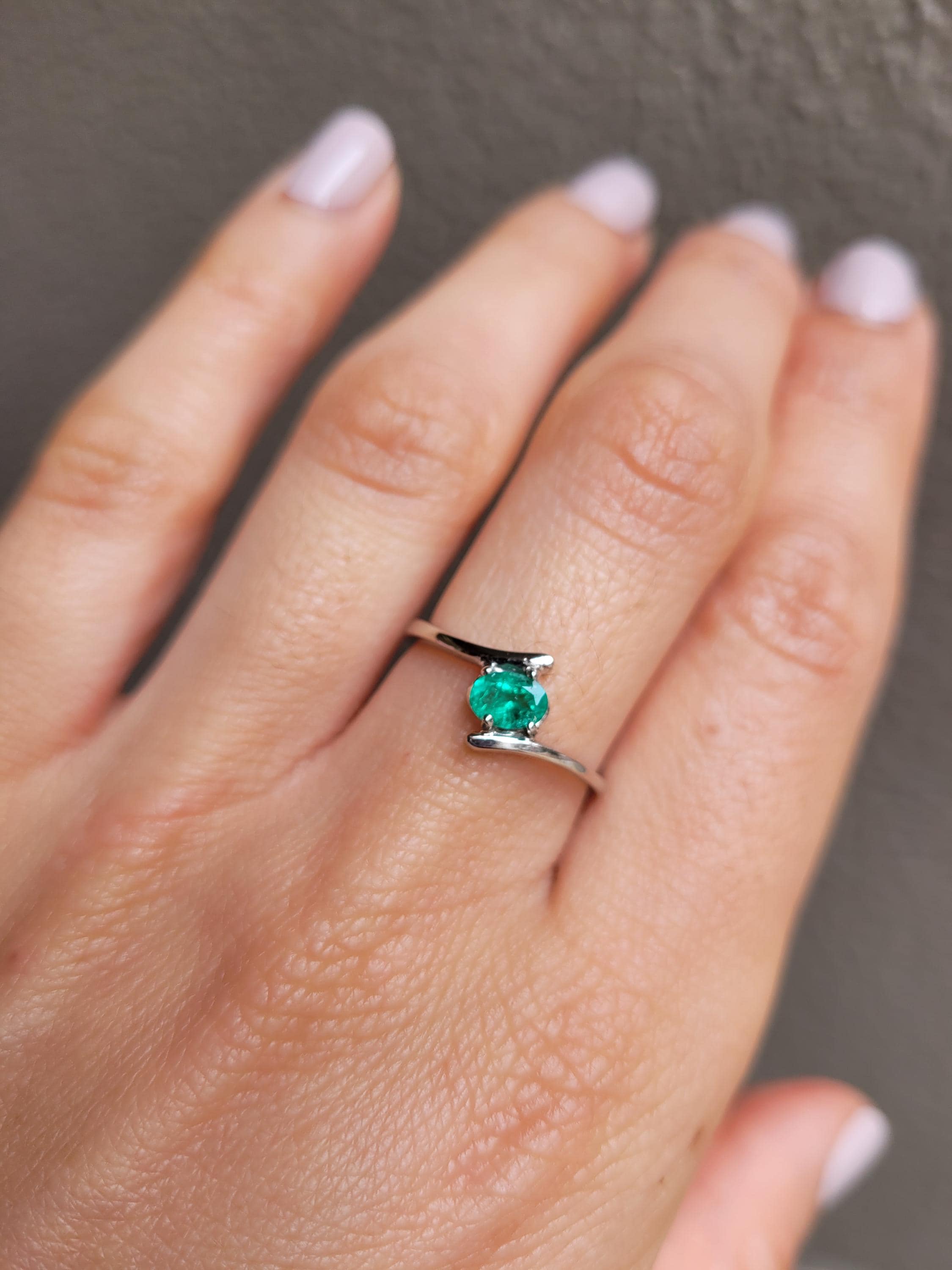 This contemporary design features a natural oval Colombian emerald set horizontally in delicate prongs, positioned between the softly separated ends of the band. Because the ring remains subtly open, the emerald appears to float at the centre, creating a sense of lightness and modern elegance.