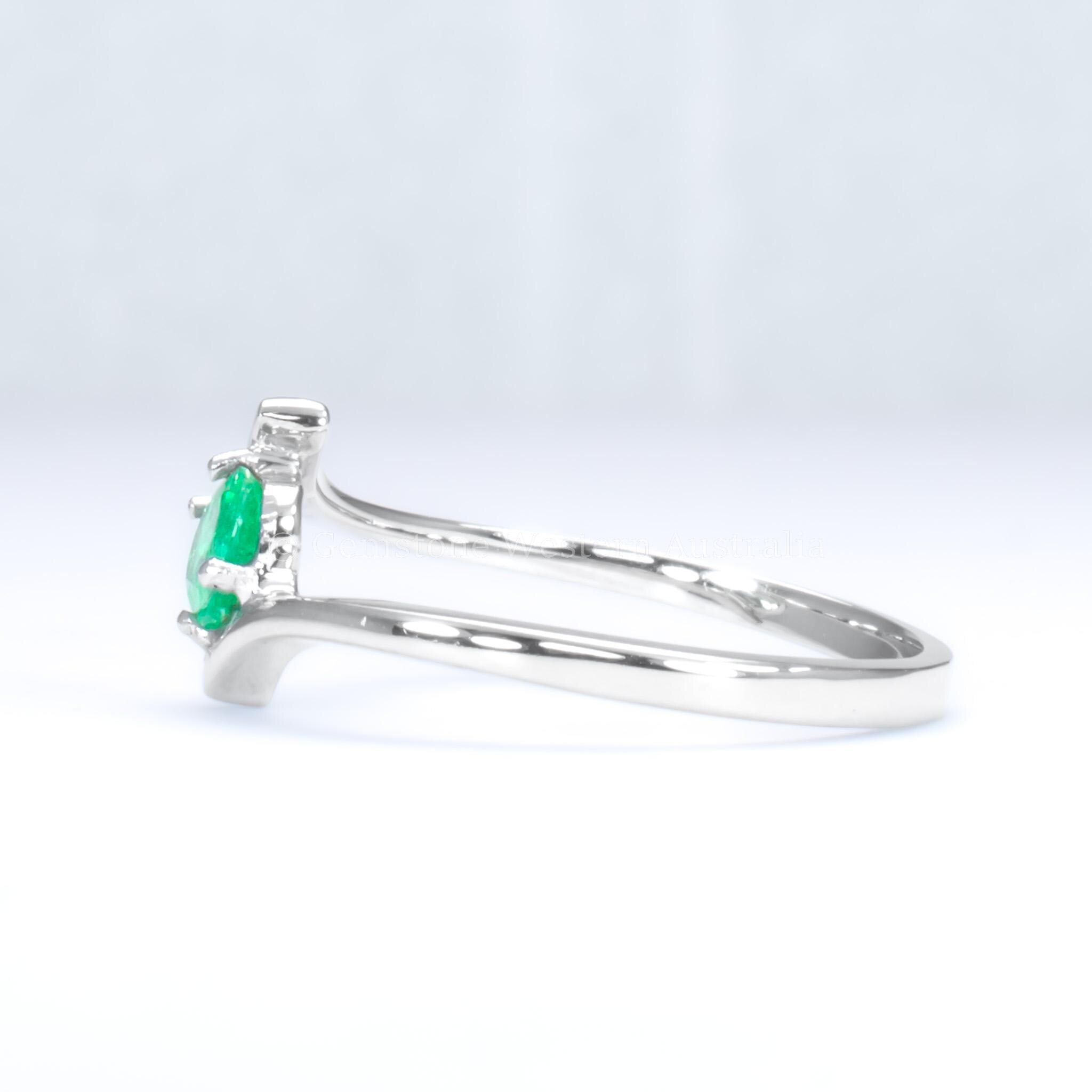 Crafted in rich 18K gold, the clean lines highlight the emerald’s vibrant green colour while offering a refined and distinctive silhouette. As a result, this one-of-a-kind piece feels both timeless and quietly contemporary, perfect for everyday elegance or a unique engagement ring.
