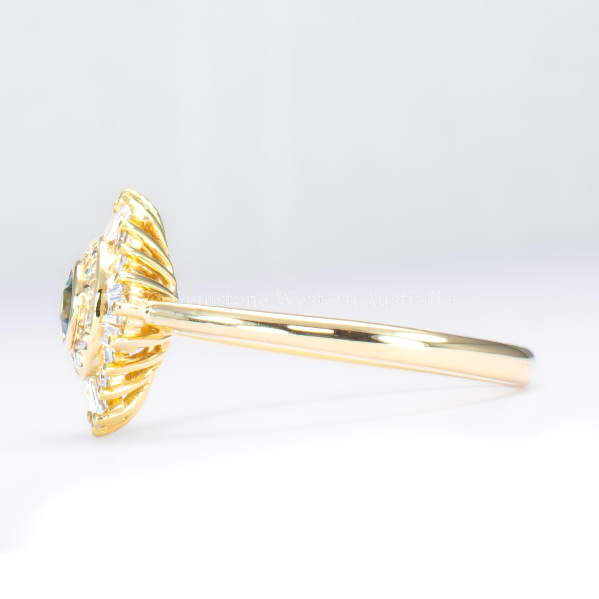 A round teal sapphire forms the heart of this elegant design, enclosed within a smooth bezel that enhances both colour and form. Because of this refined Art Deco–inspired structure, the ring reflects light softly while drawing attention to the sapphire’s deep green tones.