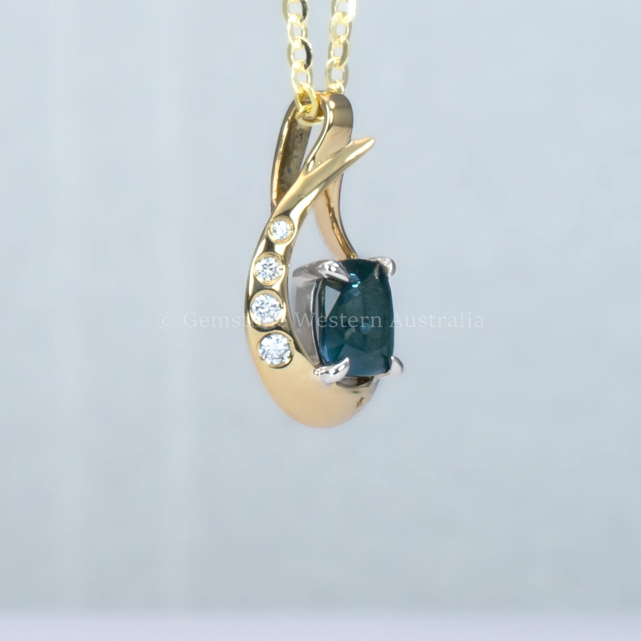 Along one side of the gold curve, a graceful line of natural diamonds is set directly into the metal, adding delicate brilliance without disturbing the clean silhouette. The sculpted bail continues the same fluid design language, allowing the pendant to sit naturally and elegantly when worn.