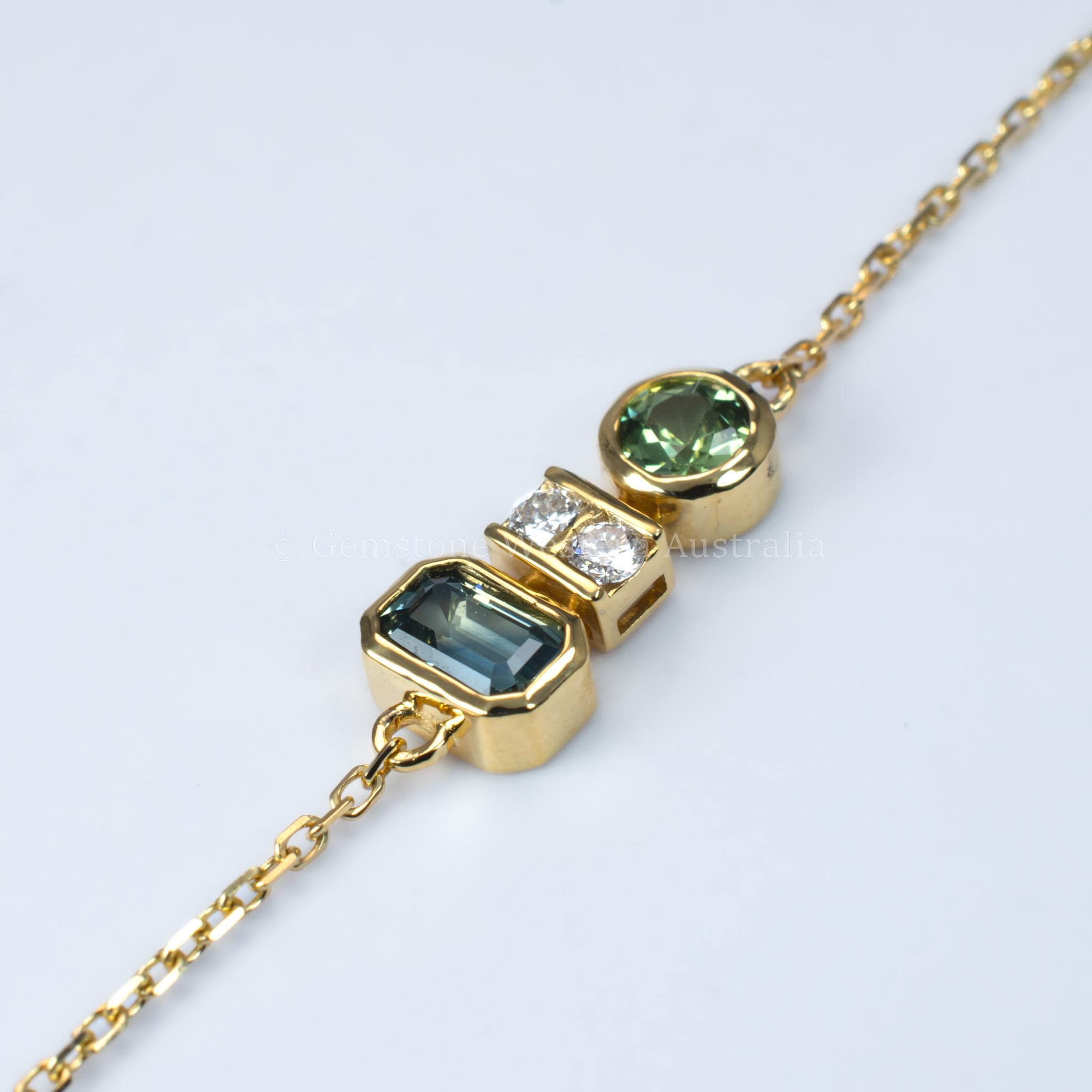 Gemstone: One natural Australian round teal green sapphire (0.21ct), two natural round brilliant cut diamonds (DEF VS - 0.06ct), one natural Australian emerald cut teal blue spphire (0.35ct).