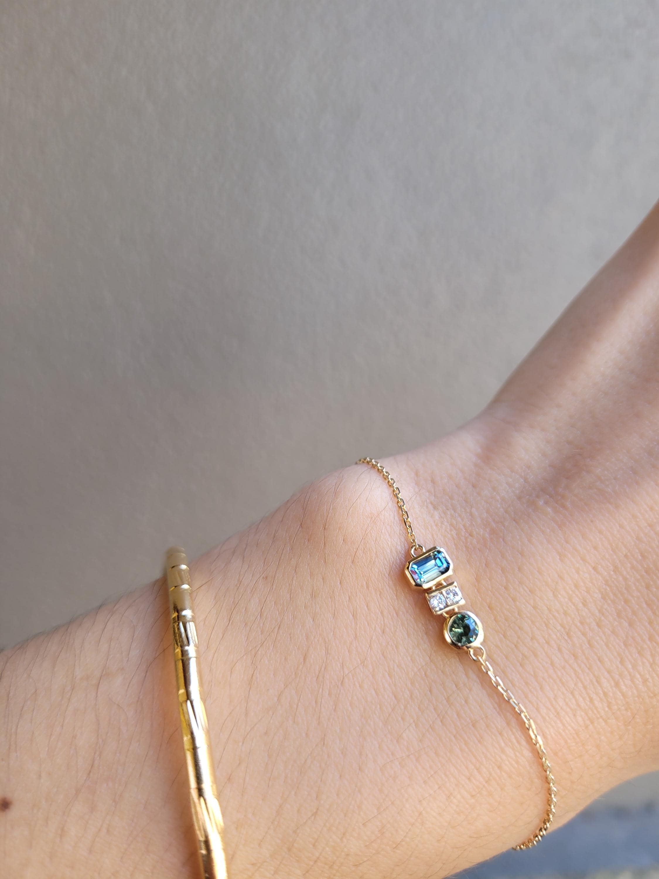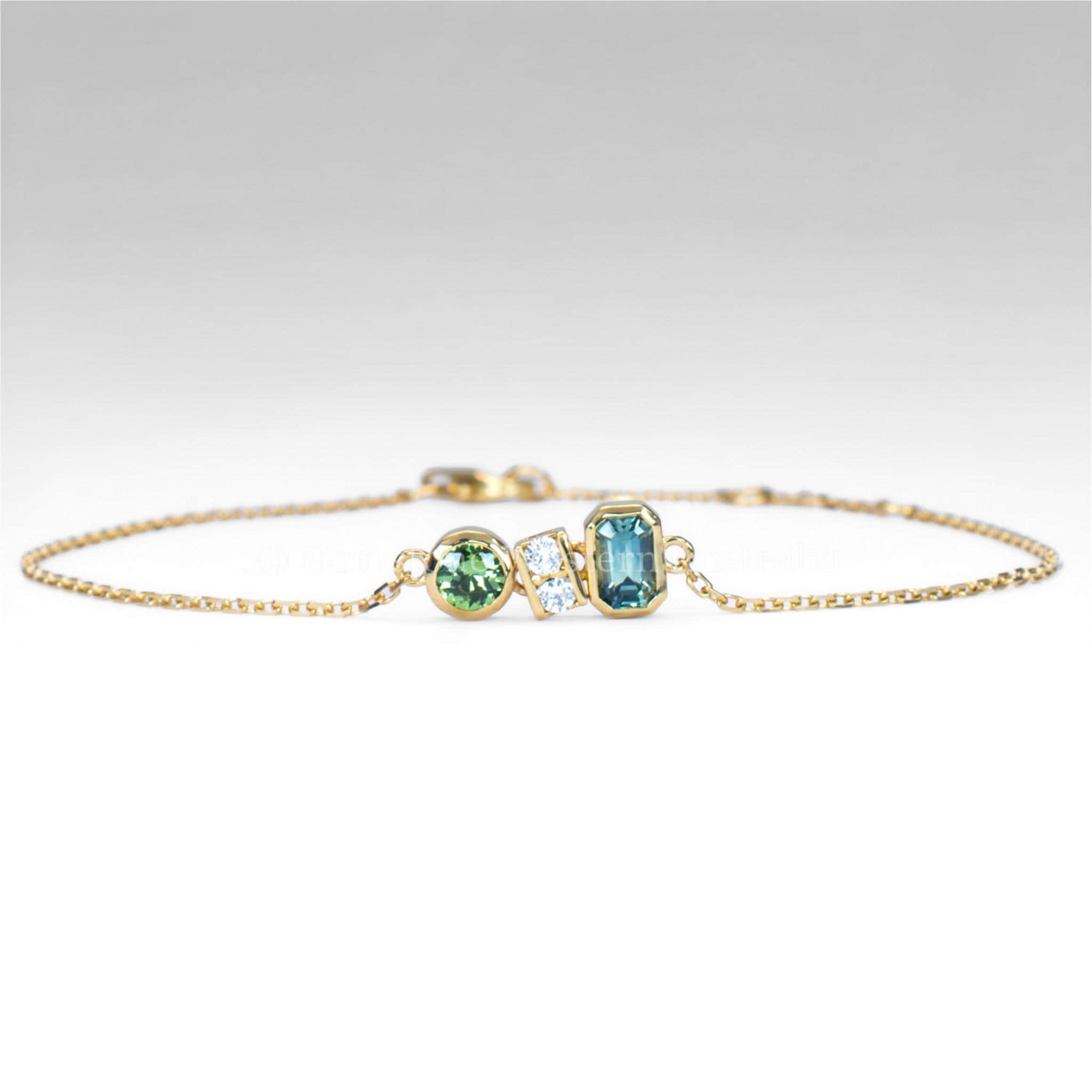 The combination of teal sapphires with the shimmering diamonds creates a harmonious play of colour and light, making this bracelet both timeless and contemporary. Its lightweight design and adjustable chain ensure a comfortable and flattering fit, perfect for layering with other fine jewellery or wearing solo as a statement piece.