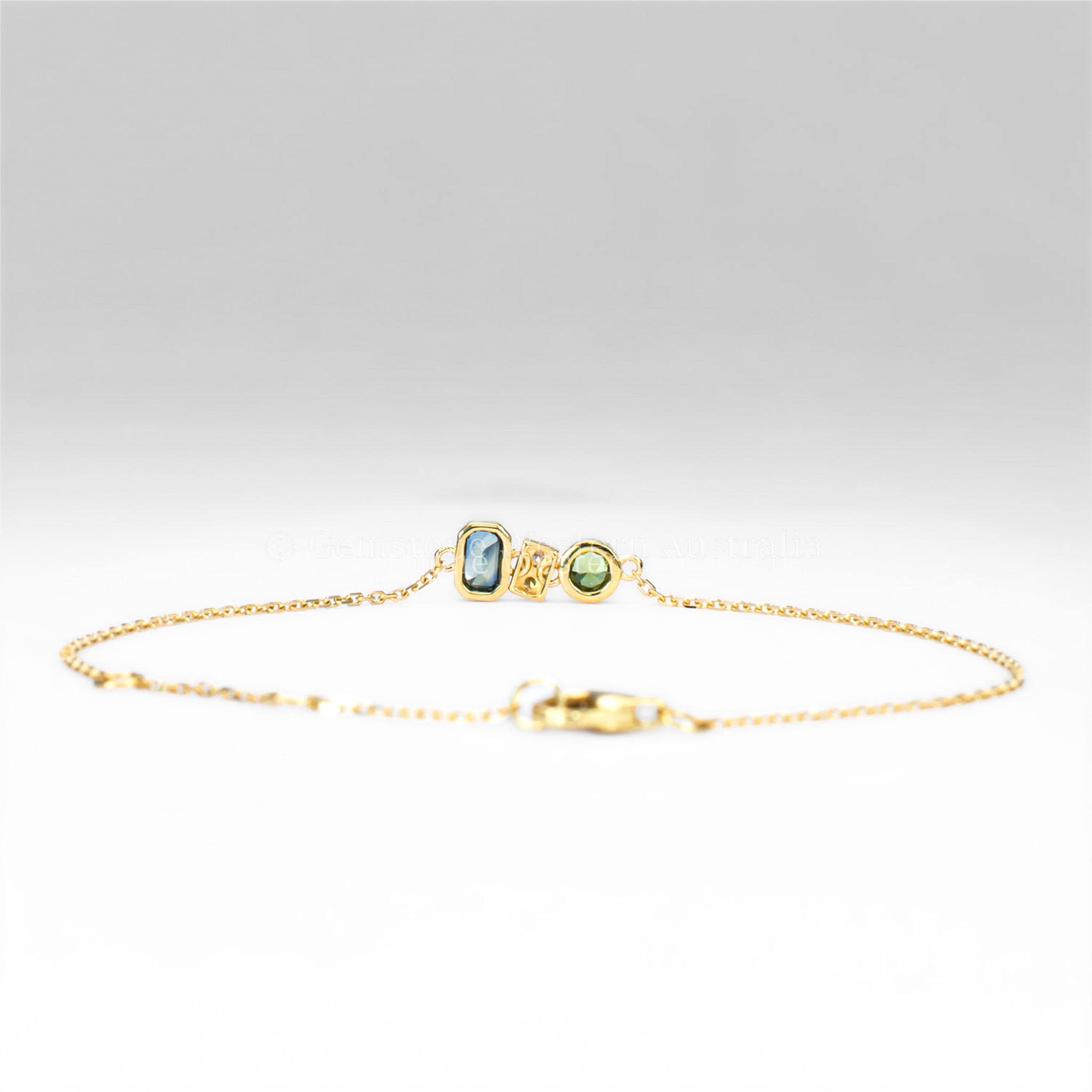 This exquisite bracelet is crafted in 18K yellow gold on a delicate chain, offering a subtle and sophisticated touch for any wrist. At the centre, a round teal green sapphire is set in a single bezel, showcasing its rich colour and brilliance.