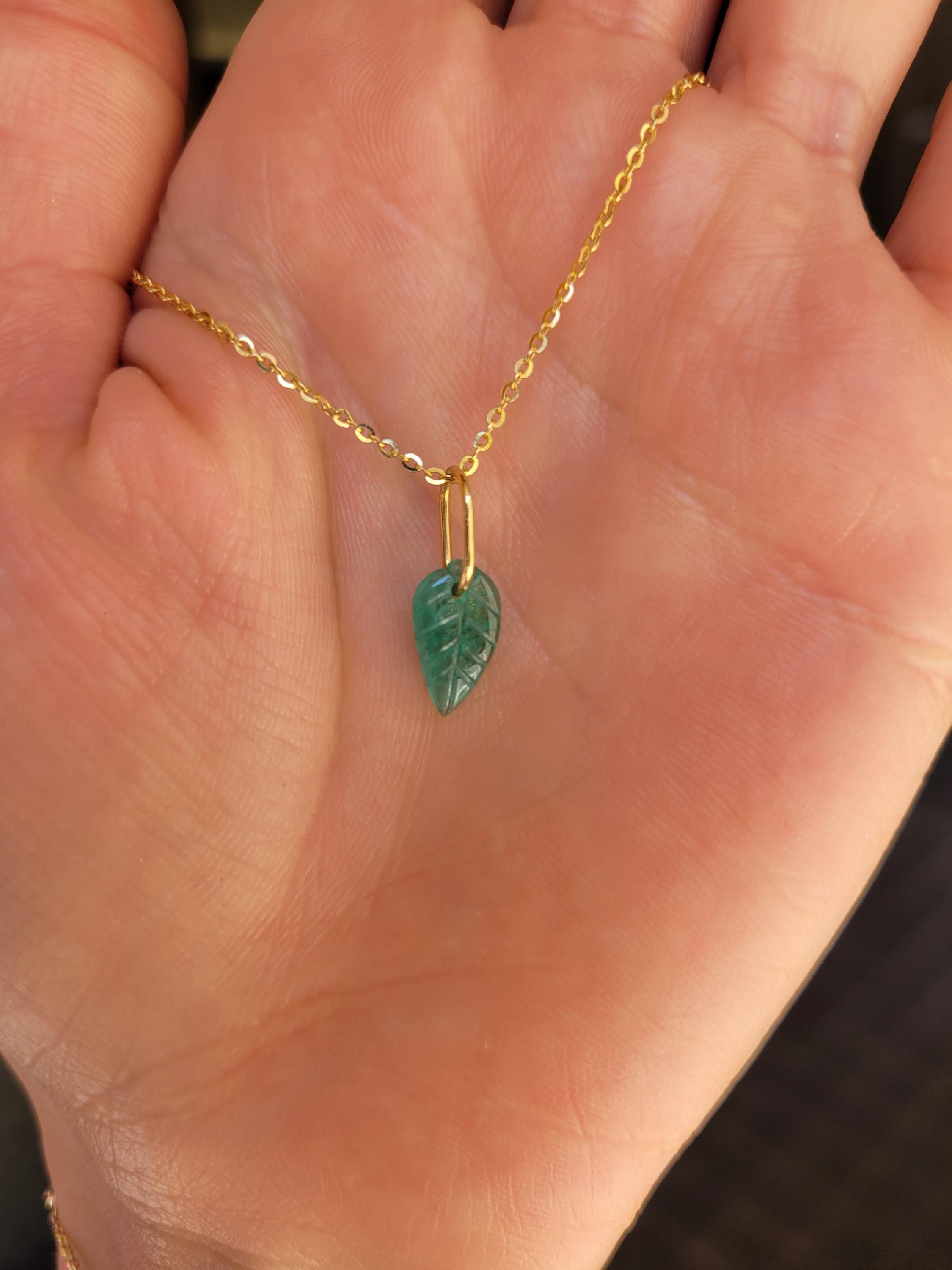 This distinctive pendant features a natural Colombian emerald, carefully carved into a refined leaf form that highlights the gemstone’s organic beauty.