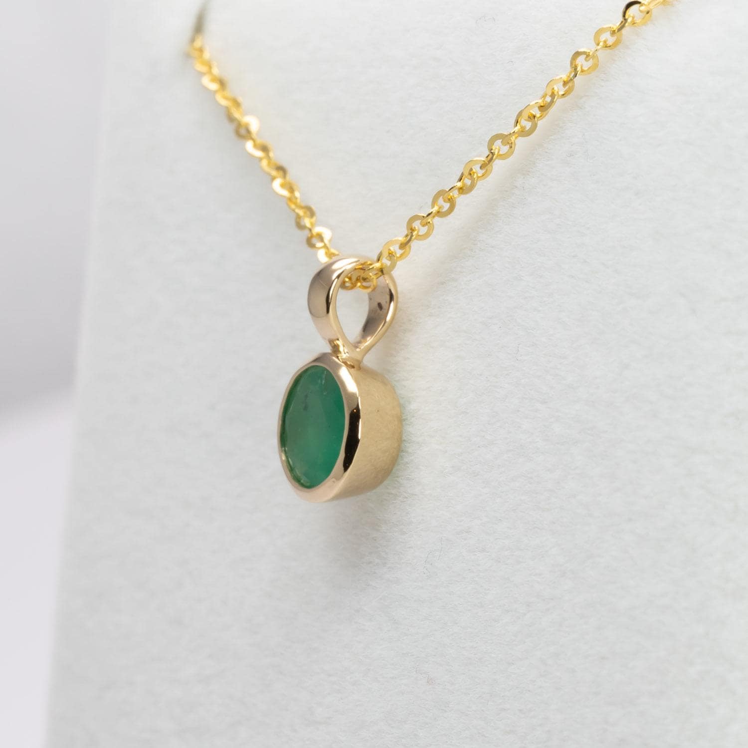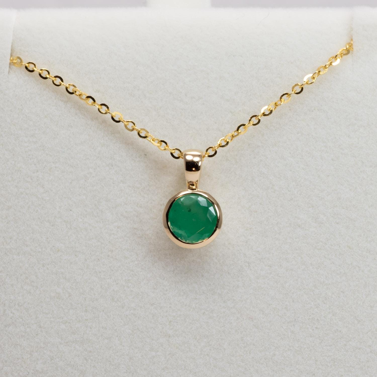 Colombian emerald pendant crafted in 18K yellow gold, featuring a 0.62ct round natural emerald secured in a smooth bezel setting. The design offers a clean, contemporary look while protecting the gemstone for everyday wear.