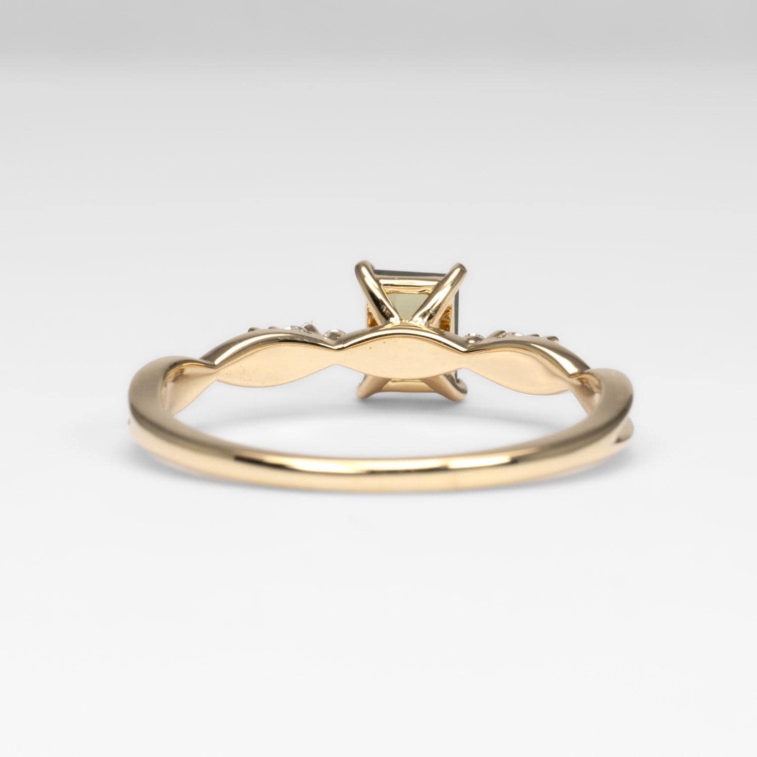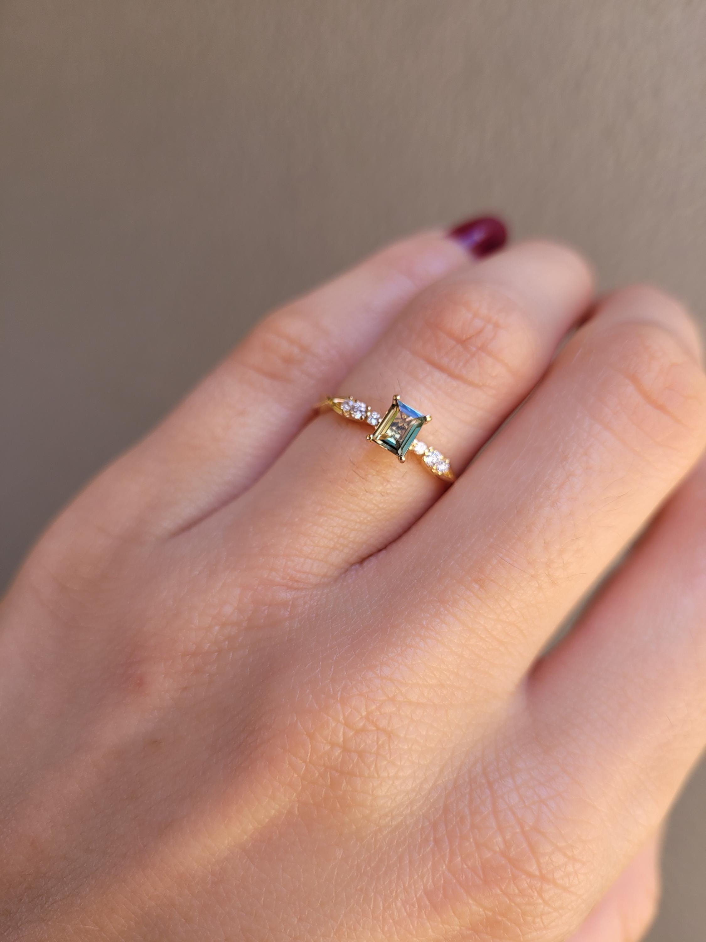This natural alexandrite and diamond ring features a 0.38ct princess-cut gemstone set in 18K yellow gold. Its clean lines and balanced design give the piece a modern yet timeless feel.