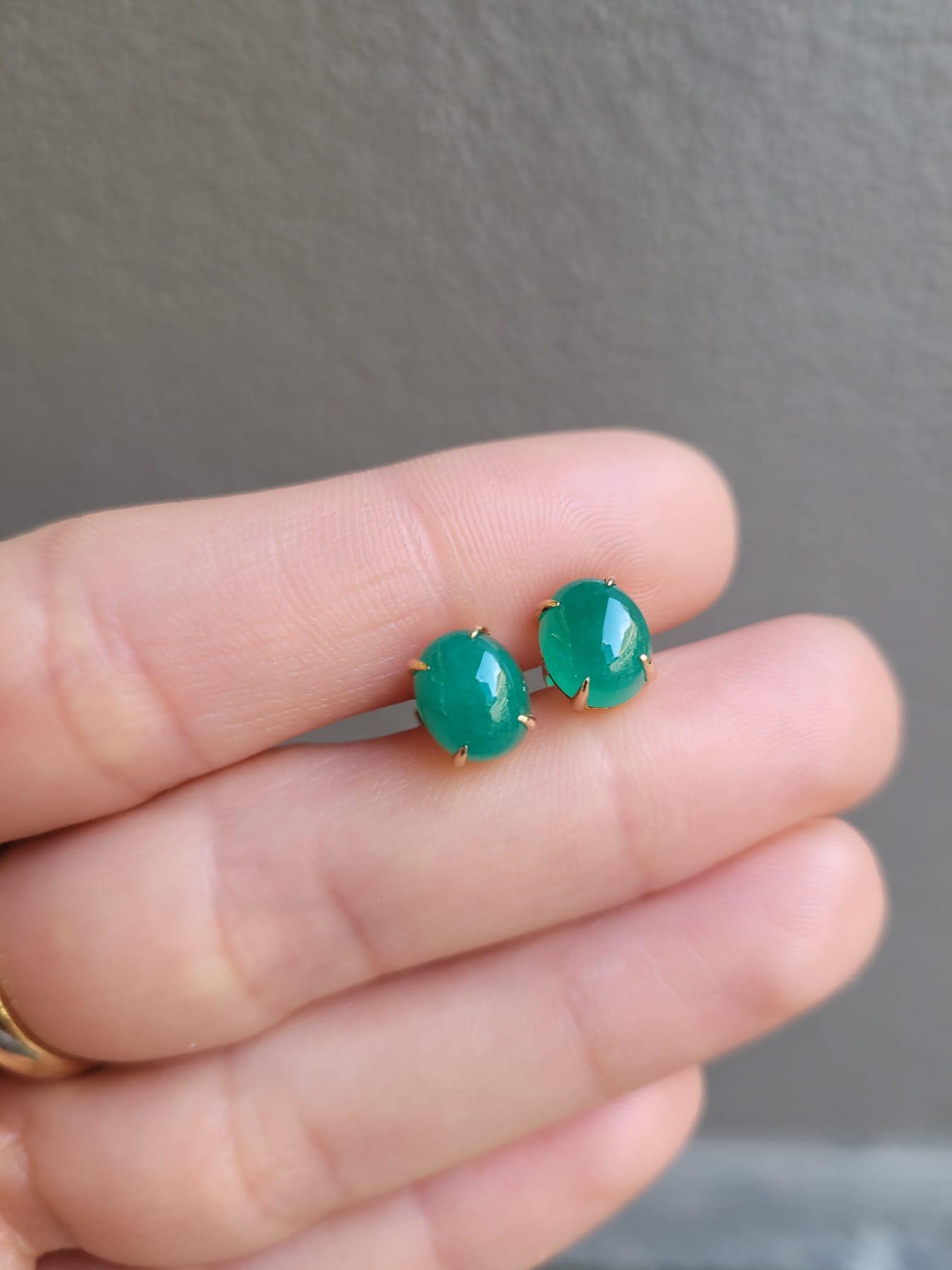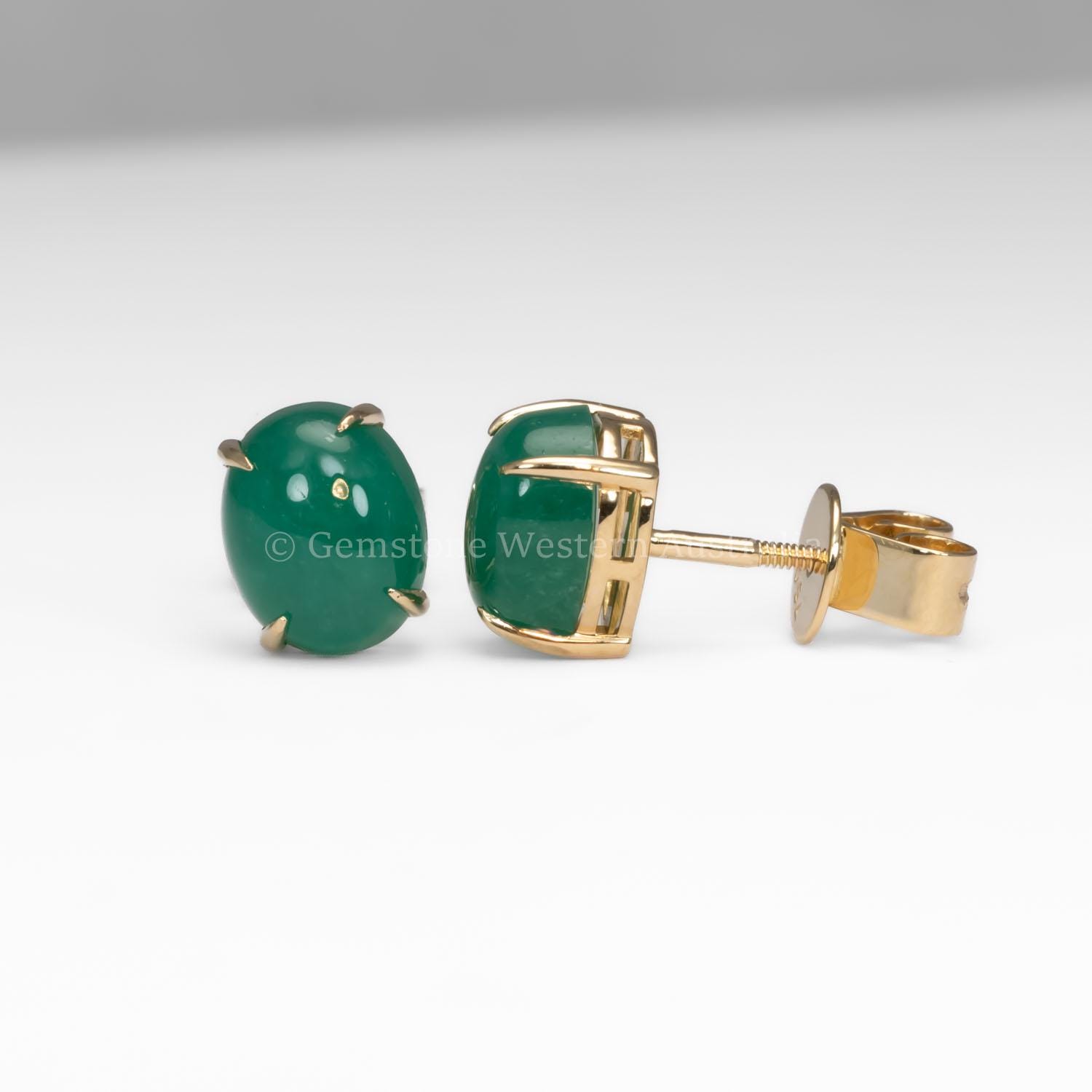 These emerald stud earrings feature a pair of natural Colombian emeralds in a smooth cabochon cut. The gemstones show a rich green colour with a soft, luminous appearance, giving the piece a refined and elegant feel.