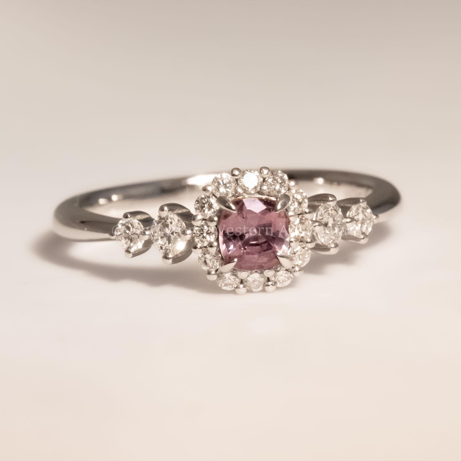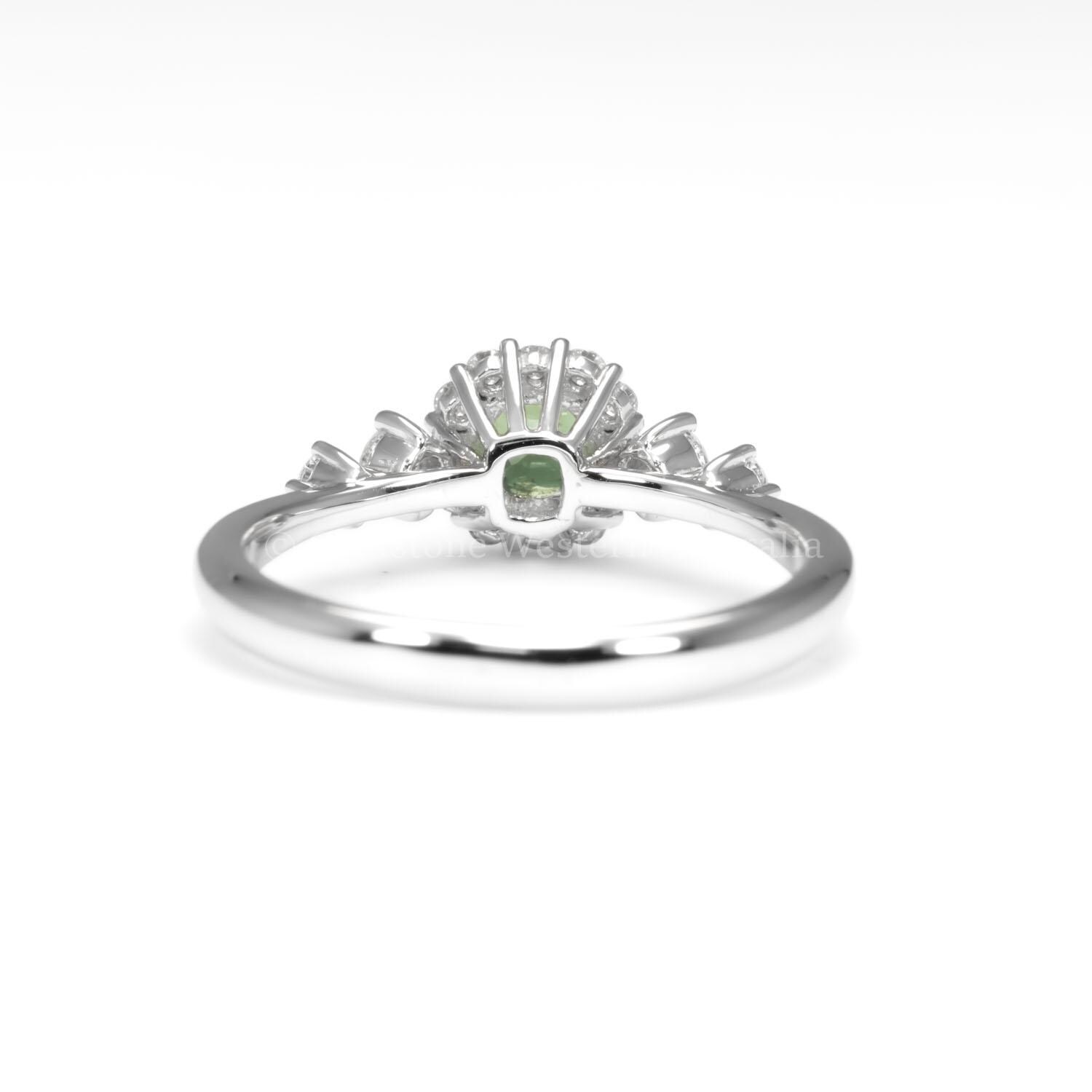 Alexandrite is prized for its rare colour-changing nature. In this ring, the combination of cushion cut and delicate diamond setting offers a timeless and elegant expression, suitable for everyday wear or a distinctive engagement ring.