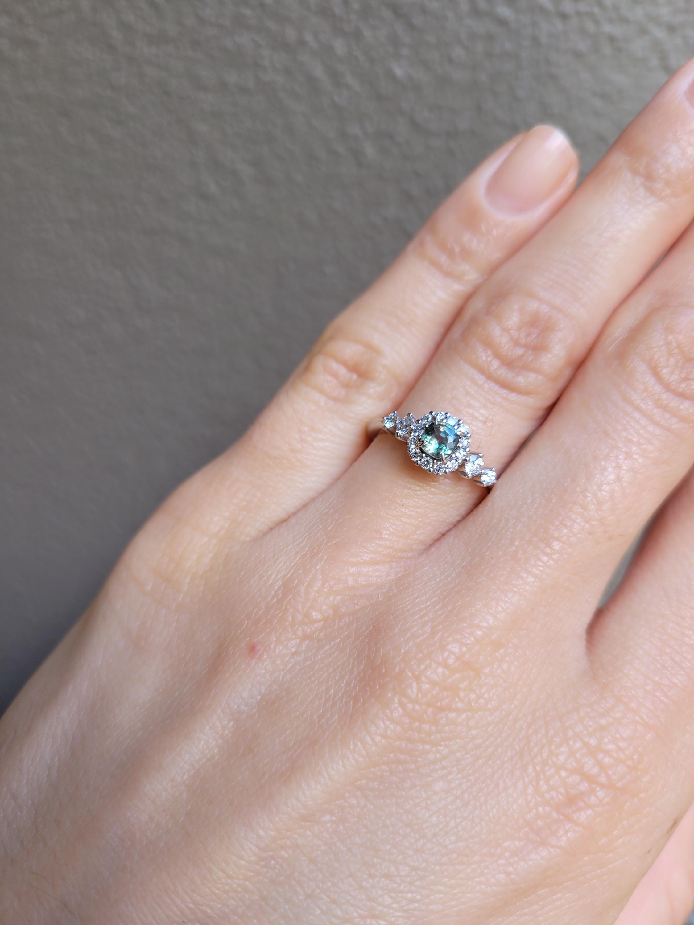 Central stone: Natural alexandrite, 4.1 x 3.9 x 2.4mm, cushion cut. Weight: 0.31ct.