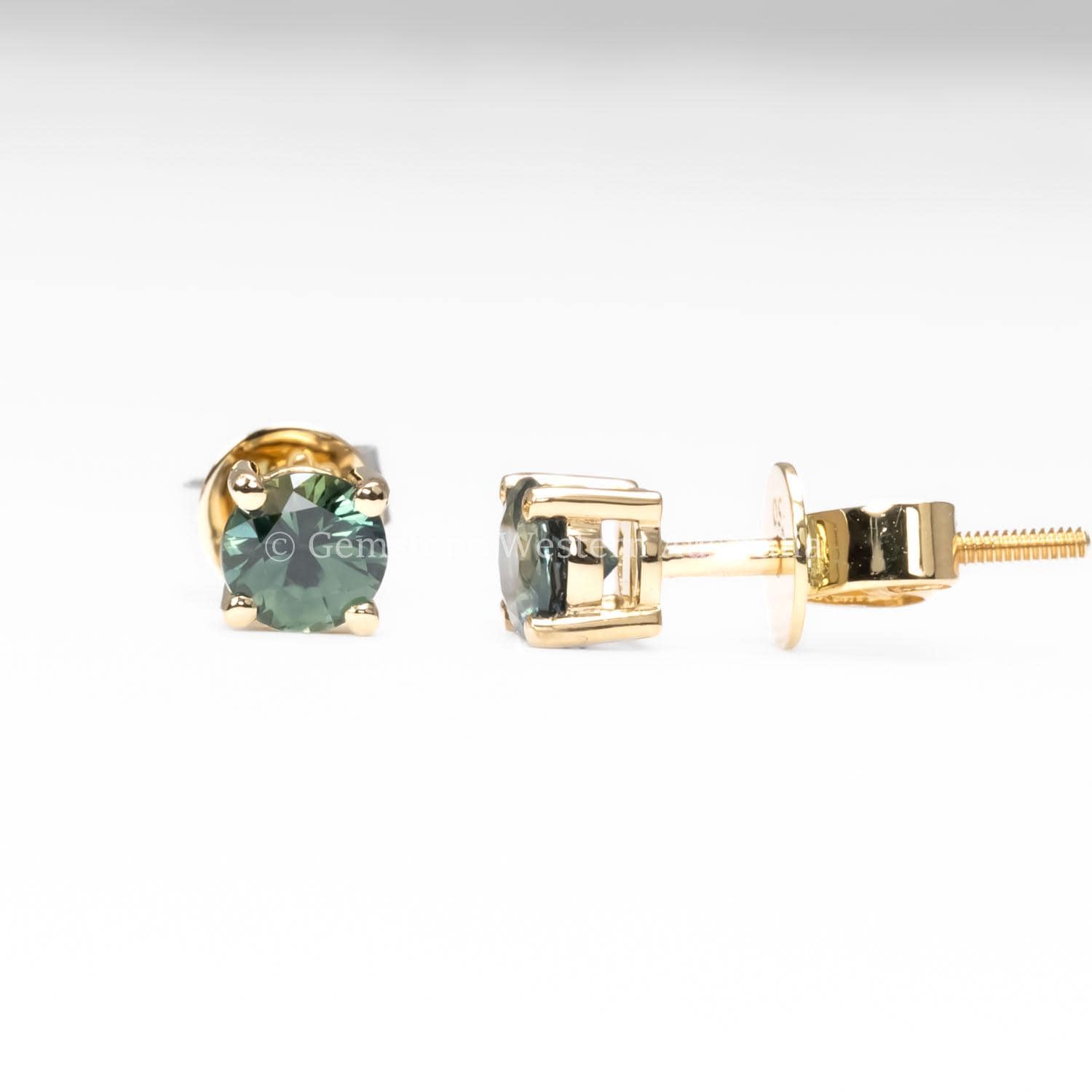 These sapphire stud earrings feature a pair of natural Australian teal sapphires totalling 0.79ct, cut in a classic round shape. The gemstones display a distinctive teal tone, blending blue and green hues for a modern and versatile look.