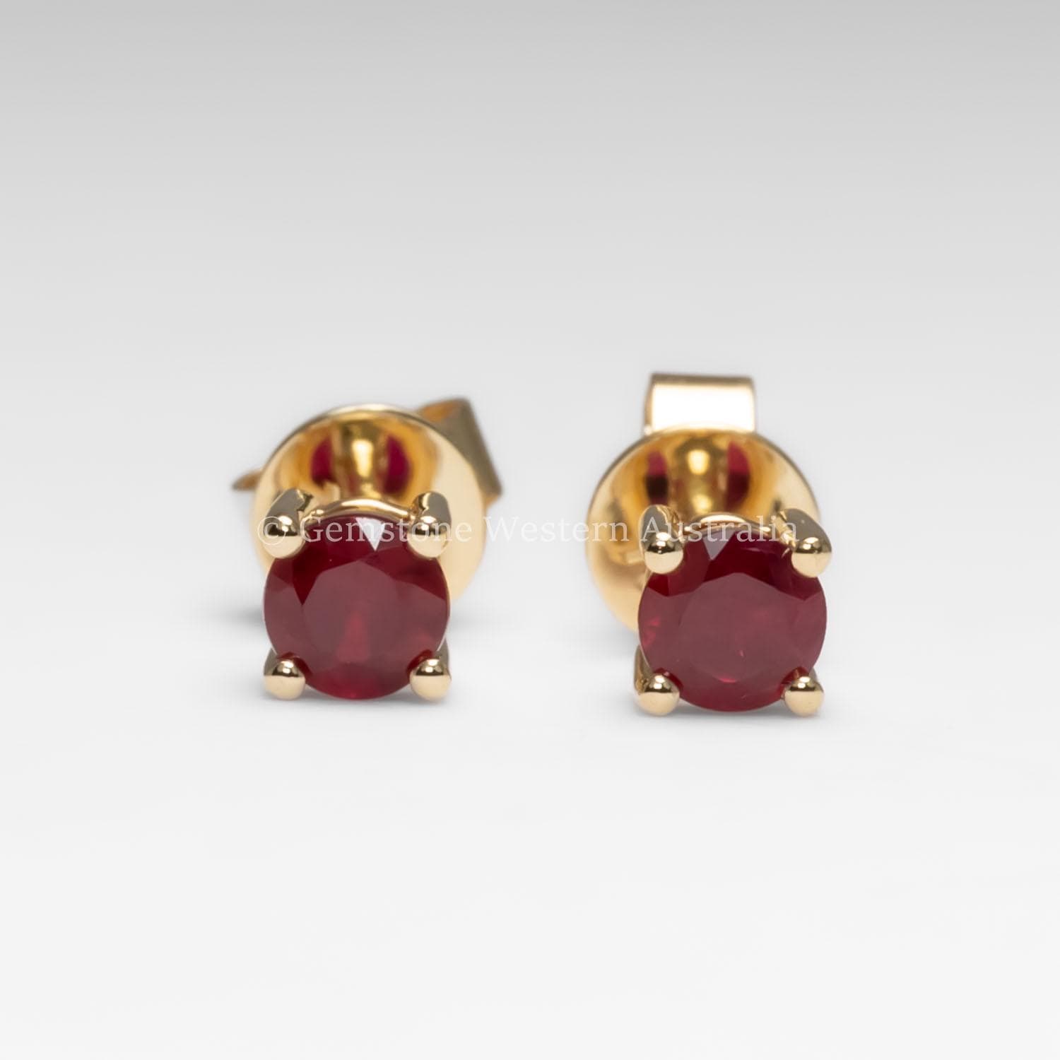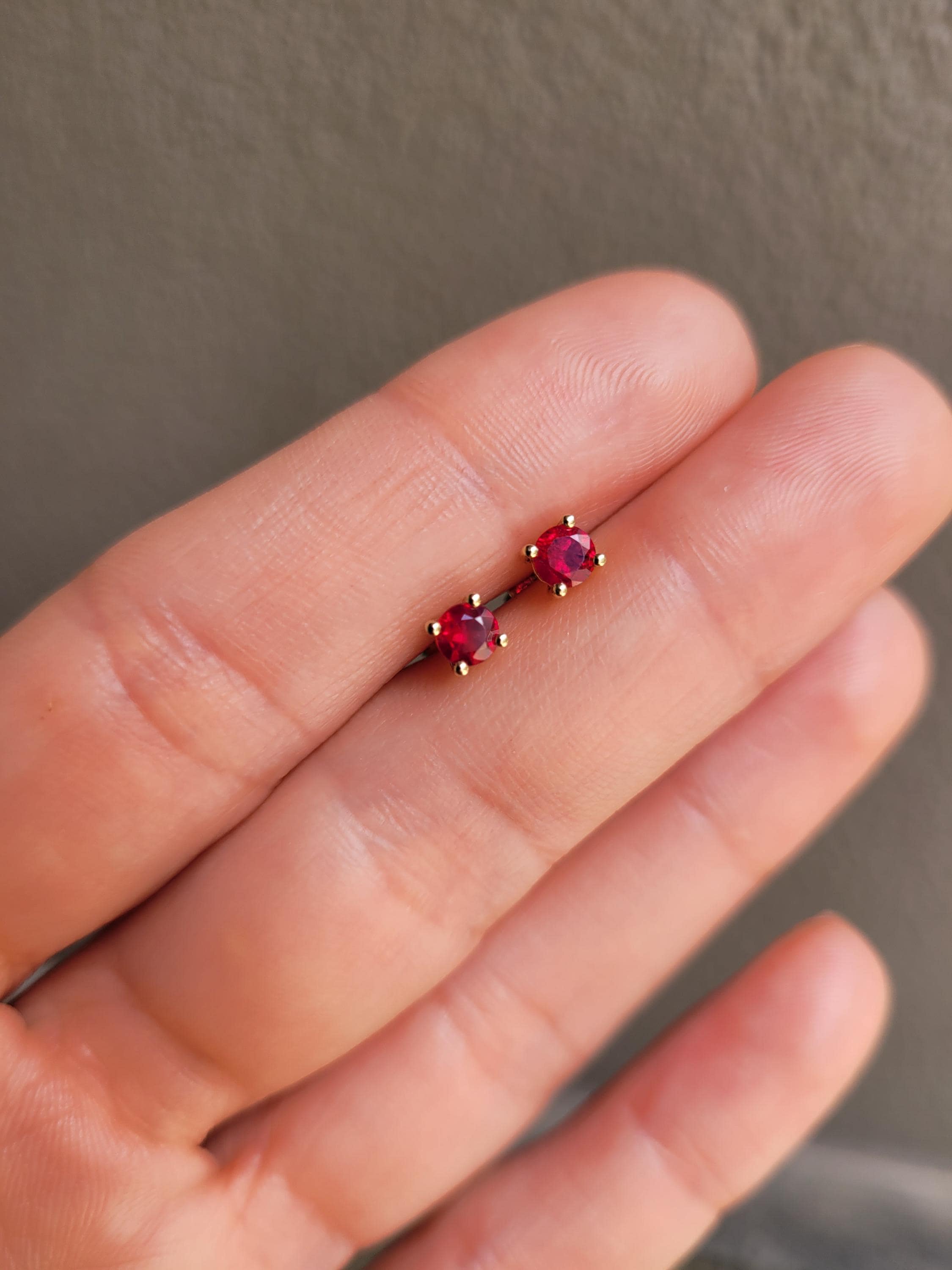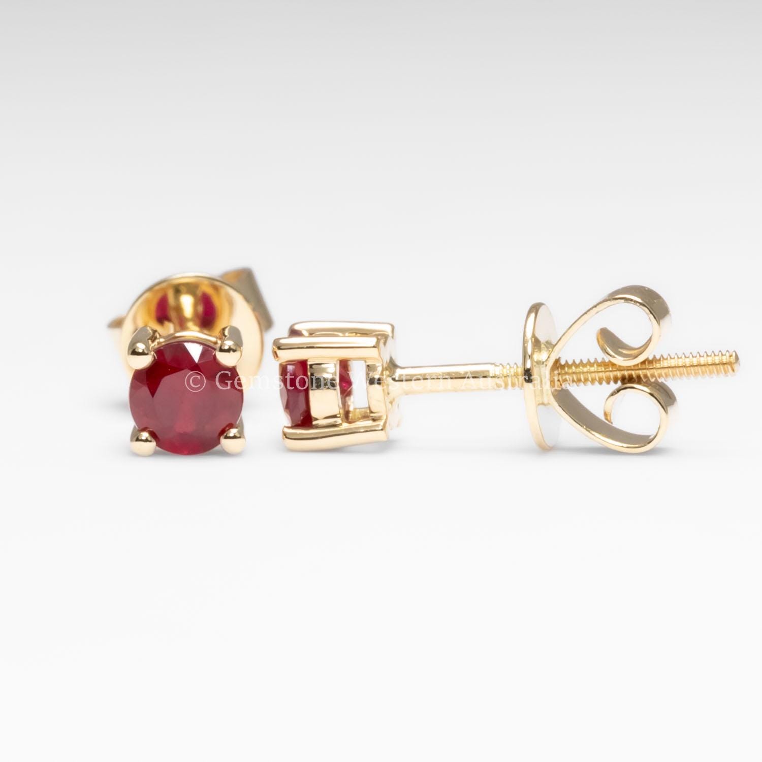 These ruby stud earrings feature a pair of natural round rubies set in a classic four claw design. The gemstones display a rich red colour, offering a timeless and elegant look suited to both everyday wear and special occasions.
