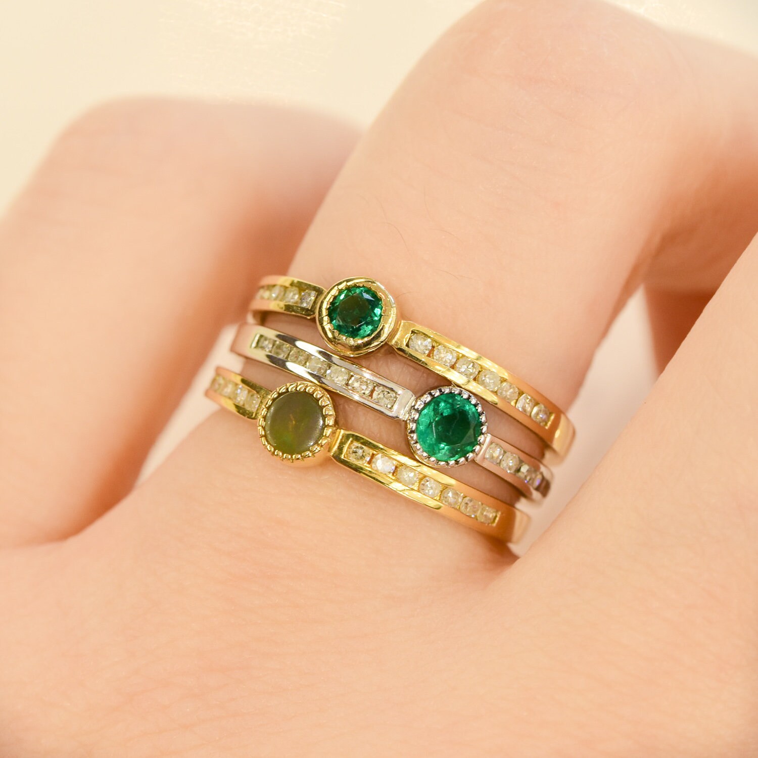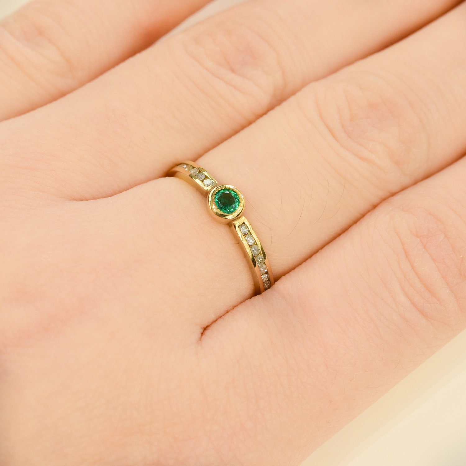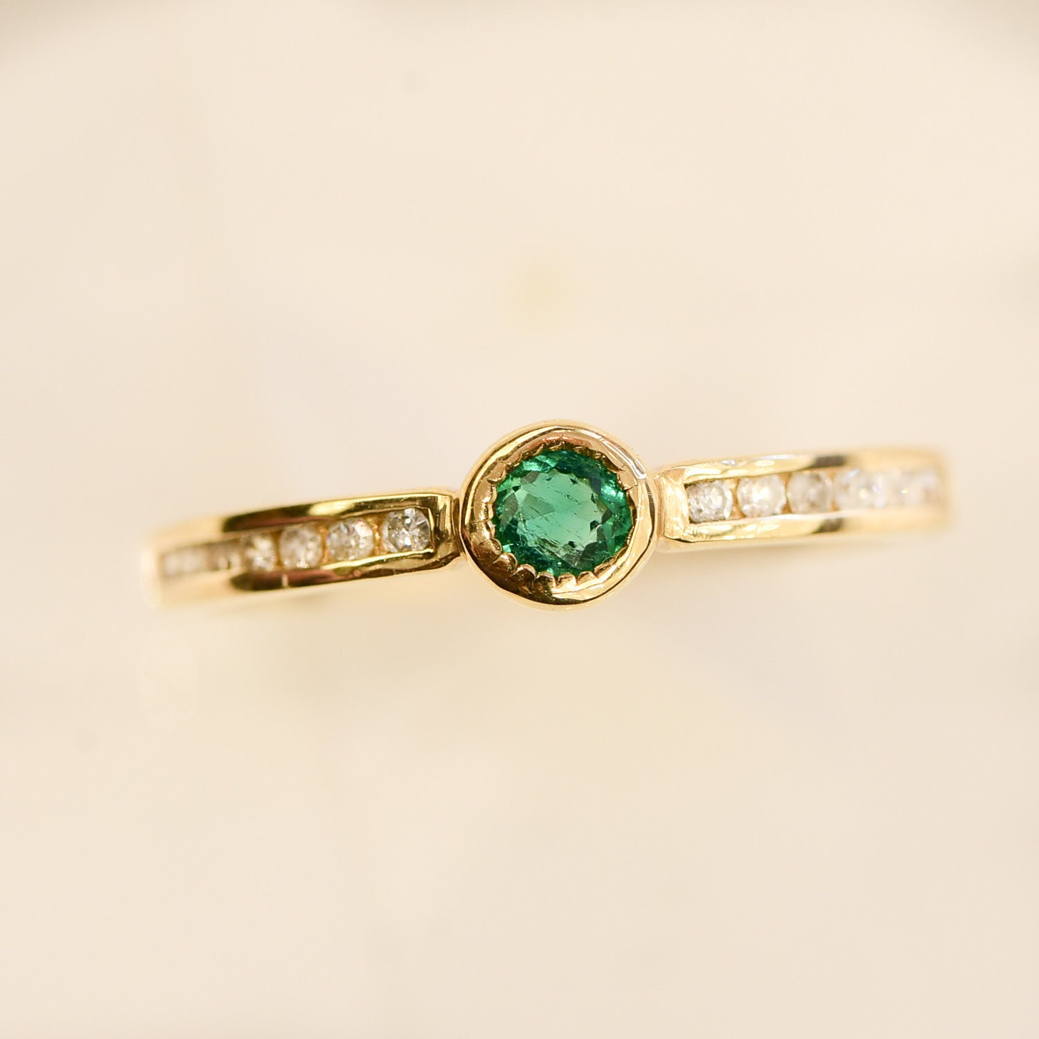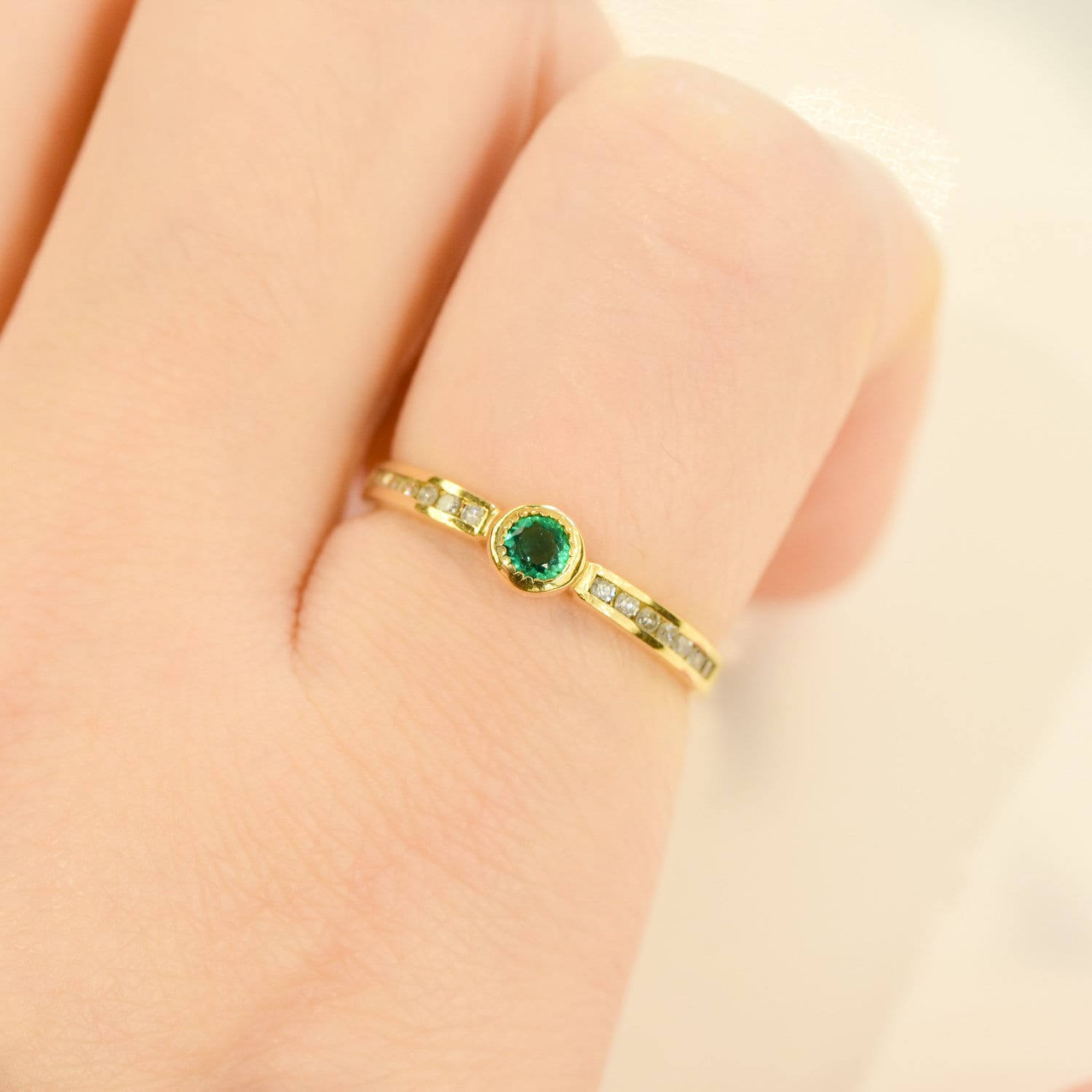 This dainty 18k gold stackable ring features a centre round cut Colombian Emerald bezel set accented with 14 channel set diamonds (7 to each side of the emerald).This ring is the perfect gift and a beautiful addition to your stackable rings collection, great for everyday wearing.